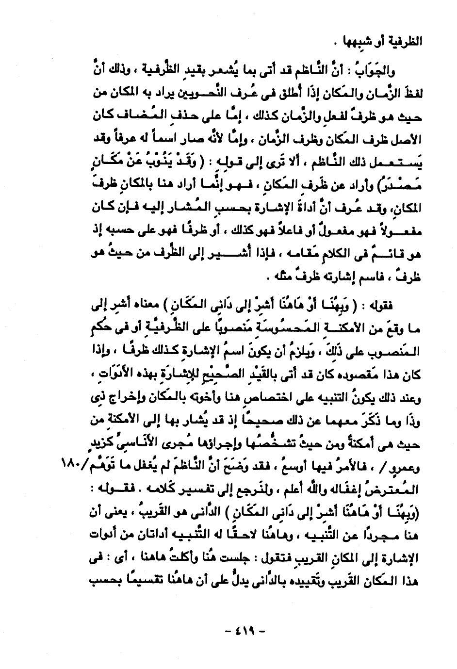 والجواب: أن الناظم قد أتى بما يشعر بقيد الظرفية، وذلك أن لفظ الزمان والمكان إذا أطلق في عرف النحويين يراد به المكان من حيث هو ظرف لفعل والزمان كذلك، إما على حذف المضاف كان الأصل ظرف المكان وظرف الزمان، وأما لأنه صار اسما له عرفا وقد يستعمل ذلك الناظم، ألا ترى إلى قوله: (وقد ينوب عن مكان مصدر) وأراد عن ظرف المكان، فهو إنما أراد هنا بالمكان ظرف المكان، وقد عرف أن أداة الإشارة بحسب المشار إليه فإن كان مفعولا فهو مفعول أو فاعلا فهو كذلك، أو ظرفا فهو على حسبه إذ هو قائم في الكلام مقامه، فإذا أشير إلى الظرف من حيث هو ظرف، فاسم إشارته ظرف مثله.