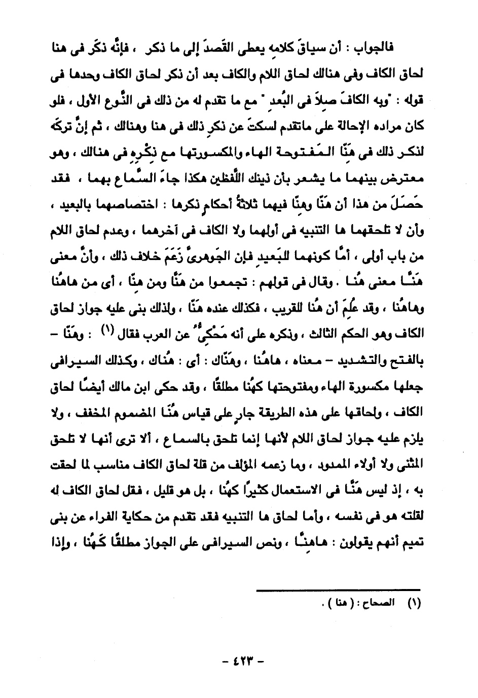 فالجواب: أن سياق كلامه يعطي القصد إلى ما ذكر، فإنه ذكر في هنا لحاق الكاف وفي هنالك لحاق اللام والكاف بعد أن ذكر لحاق الكاف وحدها وفي قوله: "وبه الكاف صلا في البعد" مع ما تقدم له من ذلك في النوع الأول، فلو كان مراده الإحالة على ما تقدم لسكت عن ذكر ذلك في هنا وهنالك، ثم إن تركه لذكر ذلك في هنا المفتوحة الهاء والمكسورتها مع ذكره في هنالك، وهو معترض بينهما ما يشعر بأن ينك اللفظين هكذا جاء السماع بهما، فقد حصل من هذا أن هنا وهنا فيهما ثلاثة أحكام ذكرها: اختصاصهما بالبعيد، وأن لا تلحقهما ها التنبيه في أولهما ولا الكاف في آخرهما، وعدم لحاق اللام من باب أولى، أما كونهما للبعيد فإن الجوهري زعم خلاف ذلك، وأن معنى هنا معنى هنا. وقال في قولهم: تجمعوا من هنا ومن هنا، أي من هاهنا وهاهنا، وقد علم أن هنا للقريب، فكذلك عنده هنا، ولذلك بنى عليه جواز لحاق الكاف وهو الحكم الثالث، وكره على أنه محكي عن العرب فقال: وهنا- بالفتح والتشديد- معناه، هاهنا، وهناك: أي: هناك، وكذلك السيرافي جعلها مكسورة الهاء ومفتوحتها كهنا مطلقا، وقد حكى ابن مالك أيضا لحاق الكاف، ولحاقها على هذه الطريقة جار على قياس هنا المضموم المخفف، ولا يلزم عليه جواز لحاق اللام لأنها إنما تلحق بالسماع، الأ ترى أنها لا تلحق المثنى ولا أولاء الممدود، وما زعمه المؤلف من قلة لحاق الكاف مناسب لما لحقت به، إذ ليس هنا في الاستعمال كثير كهنا، بل هو قليل، فقل لحاق الكاف له لقلته هو في نفسه، وأما لحاق ها التنبيه فقد تقدم من حكاية الفراء عن بني تميم أنهم يقولون: هاهنا، ونص السيرافي على الجواز مطلقا كهنا، وإذا