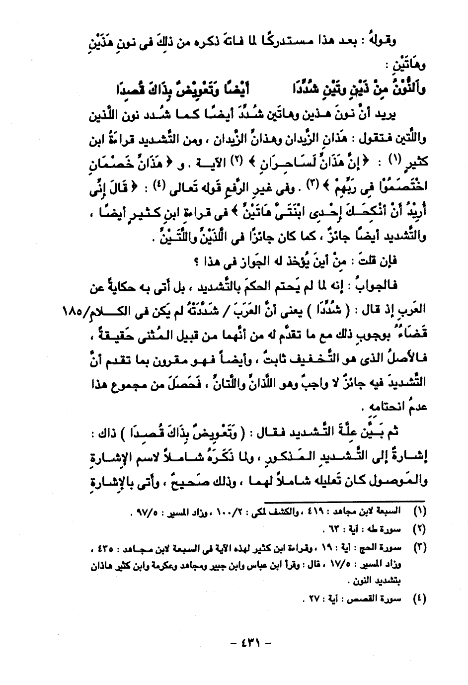 يريد أن نون هذين وهاتين شدد أيضا كما شدد نون اللذين واللتين فتقول: هذان الزيدان وهذان الزيدان، ومن التشديد قراءة ابن كثير: {إن هذان لساحران} الآية. و {هذان خصمان اختصموا في ربهم}. وفي غير الرفع قوله تعالى: {قال إني أريد أن أنكحك إحدى ابنتي هاتين} في قراءة ابن كثير أيضا، والتشديد أيضا جائز، كما كان جائزا في اللذين واللتين.