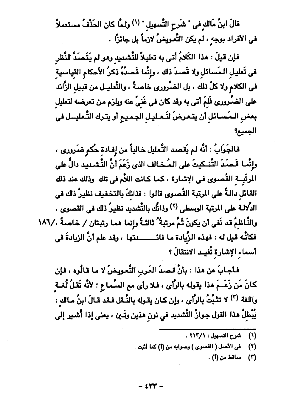 فأجاب عن هذا: بأن قصد العرب التعويض لا ما قالوه، فإن كان من زعم هذا بقوله بالرأي، فلا رأي مع السماع؛ لأنه نقل لغة واللغة لا تثبت بالرأي، وإن كان يقوله بالنقل فقد قال ابن مالك: يبطل هذا القول جواز التشديد في نون هذين وتين، يعني إذا أشير إلى