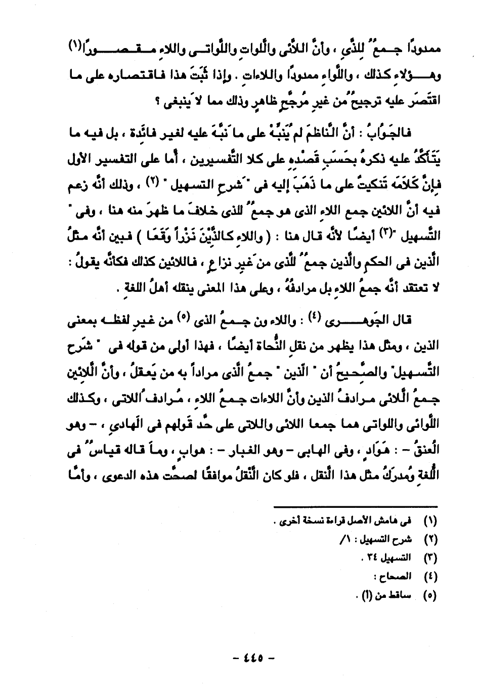 قال الجوهري: واللاءون جمع الذي من غير لفظه بمعنى الذين، ومثل هذا يظهر من نقل النحاة أيضا، فهذا أولى من قوله في "شرح التسهيل" والصحيح أن "الذين" جمع الذي مرادا به من يعقل، وأن اللائين جمع اللائي مرادف الذين وأن اللاءات جمع اللاء، مرادف اللاتي، وكذلك اللوائي واللواتي هما جمعا اللائي واللاتي على حد قولهم في الهادي، -وهو العنق-: هواد، وفي الهابي- وهو الغبار-: هواب، وما قاله قياس في اللغة ومدرك مثل هذا النقل، فلو كان النقل موافقا لصحت هذه الدعوى، وأما