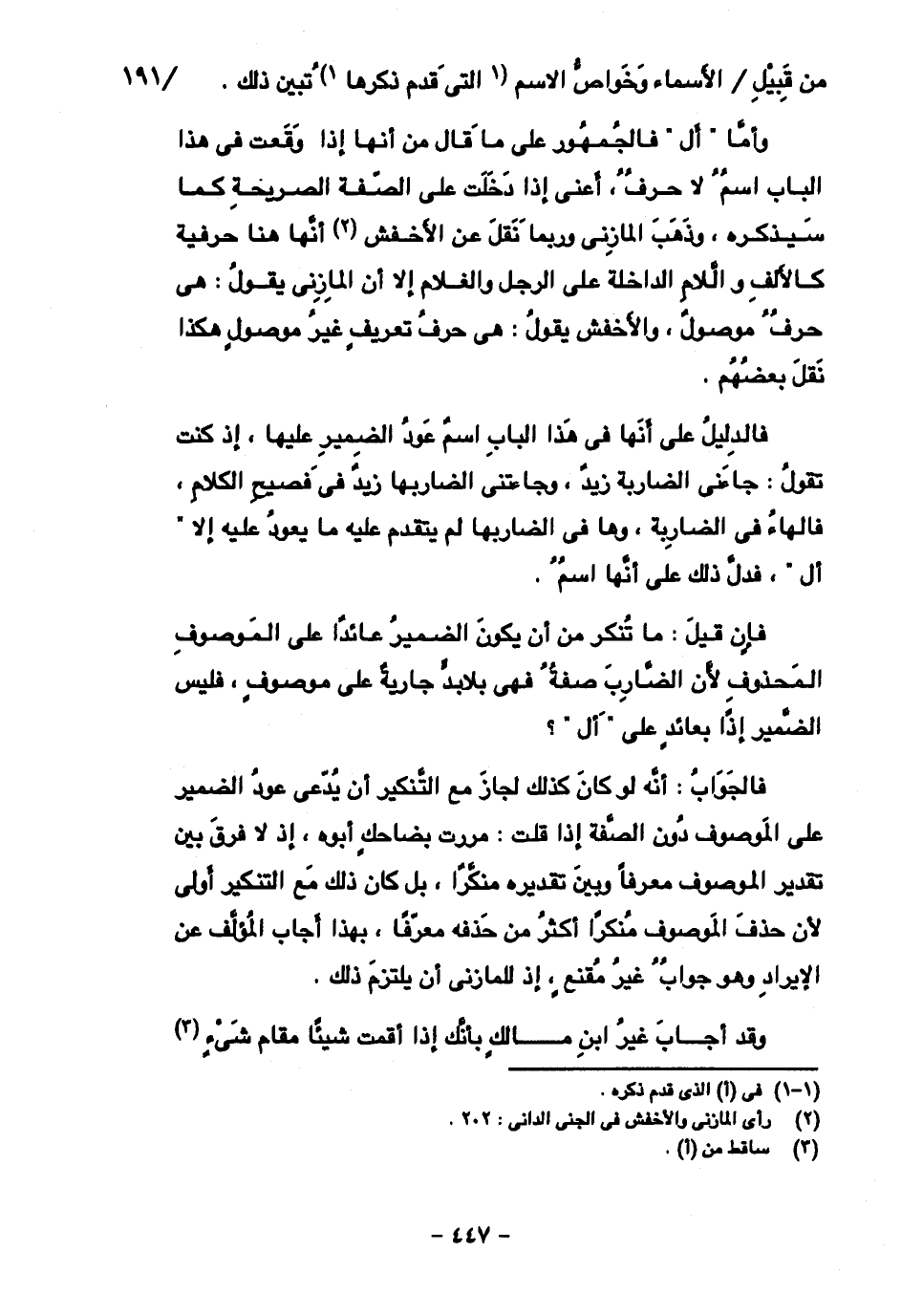 فالجواب: أنه لو كان كذلك لجاز مع التنكير أن يدعى عود الضمير على الموصوف دون الصفة إذا قلت: مررت بضاحك أبوه، إذ لا فرق بين تقدير الموصوف معرفا وبين تقديره منكرا، بل كان ذلك مع التنكير أولى لأن حذف الموصوف منكرا أكثر من حذفه معرفا، بهذا أجاب المؤلف عن الإيراد وهو جواب غير مقنع، إذ للمازني أن يلتزم ذلك.