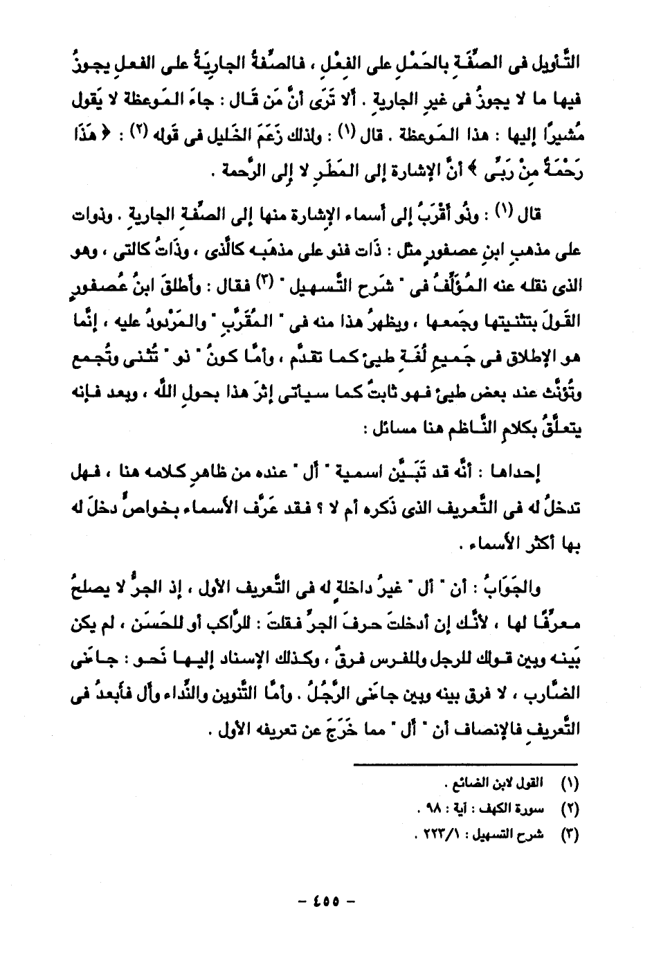 والجواب: أن "أل" غير داخلة له في التعريف الأول، إذ الجر لا يصلح معرفا لها، لأنك إن أدخلت حرف الجر فقلت: للراكب أو للحسن، لم يكن بينه وبين قولك للرجل وللفرس فرق، وكذلك الإسناد إليها نحو: جاءني الضارب، لا فرق بينه وبين جاءني الرجل. وأما التنوين والنداء وأل فأبعد في التعريف فالإنصاف أن "أل" مما خرج عن تعريفه الأول.