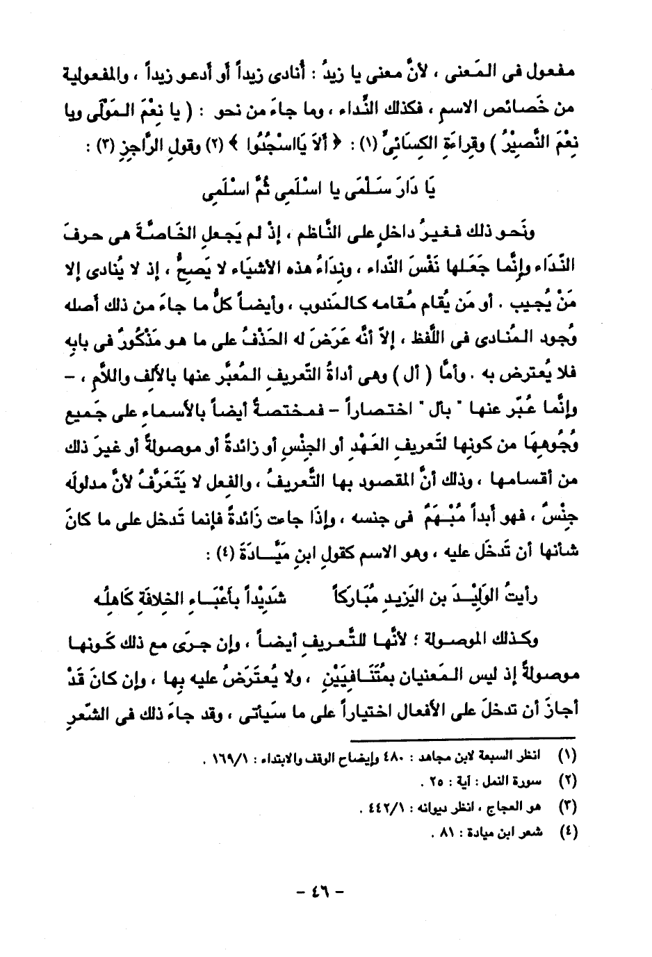 مفعول في المعنى، لأن معنى يا زيد: أنادي زيدا او أدعو زيدا، والمفعولية من خصائص الاسم، فكذلك النداء، وما جاء من نحو: (يا نعم المولى ويا نعم النصير) وقراءة الكسائي: ((ألّا يسجدوا)) وقول الراجز: