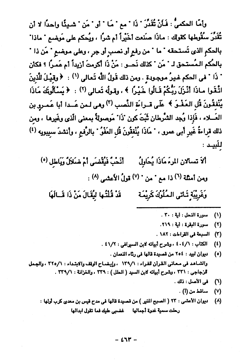 وأما الحكمي: فأن تقدر "ذا" مع "ما" أو "من" شيئا واحدا لا أن تقدر سقوطها كقولك: ماذا صنعت أخيرا أم شرا، ويحكم على موضع "ماذا" بالحكم الذي تستحقه "ما" من رفع أو نصب أو جر، وعلى موضع "من ذا" بالحكم المستحق لـ "من" كذلك نحو: من ذا أكرمت أزيدا أم عمرا؟ فكأن "ذا" في الحكم غير موجودة، ومن ذلك قول الله تعالى: {وقيل للذين اتقوا ماذا ربكم قالوا خيرا}، وقوله تعالى: {يسألونك ماذا ينفقون قل العفو} على قراءة النصب وهي لمن عدا أبا عمرو بن العلاء، فإذا وجد الشرطان ثبت كون "ذا" موصولة بمعنى الذي وغيرها، ومن ذلك قراء غير أبي عمرو، "ماذا ينفقون قل العفو" بالرفع، وأنشد سيبويه للبيد: