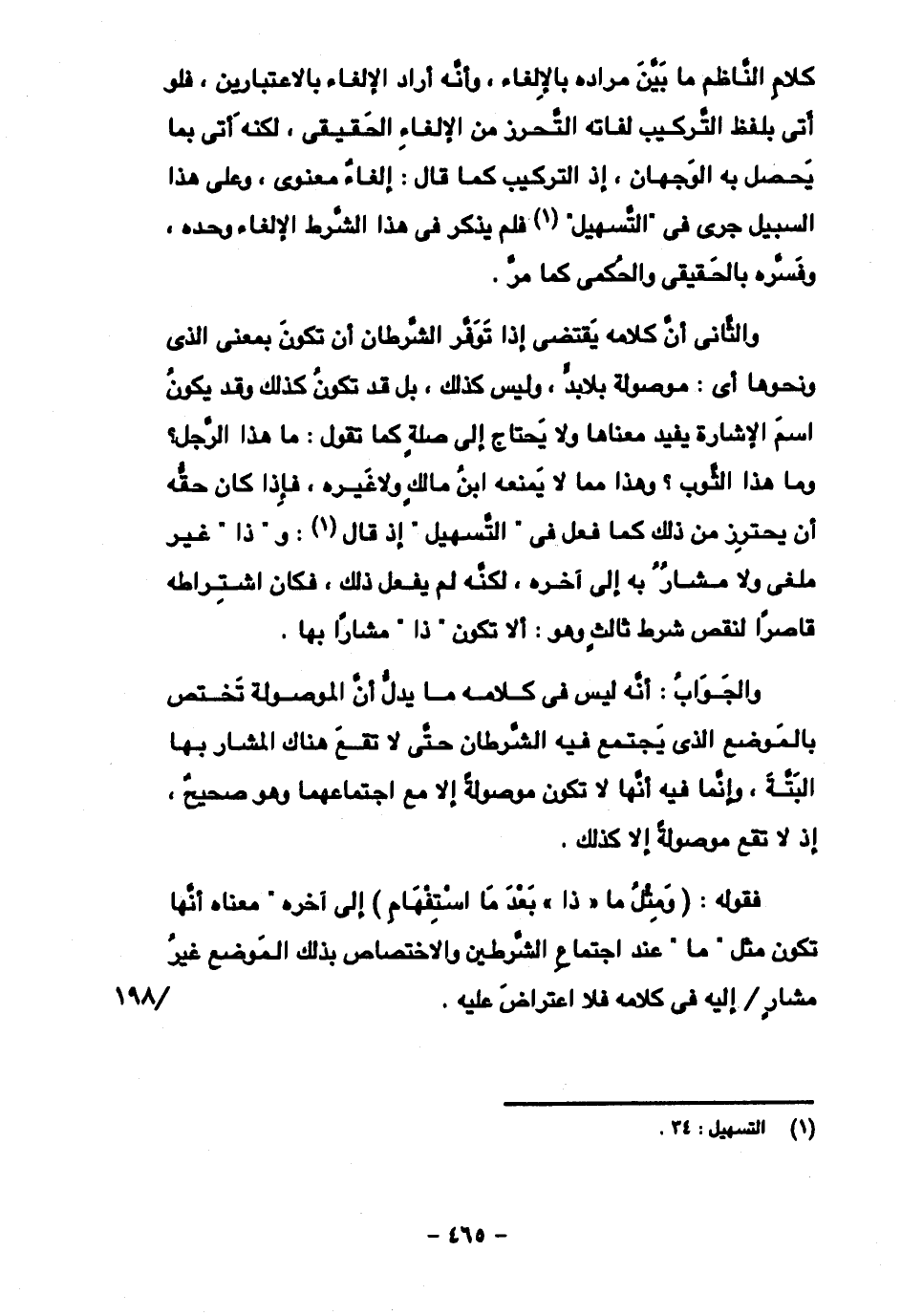والثاني: أن كلامه يقتضى إذا توفر الشرطان أن تكون بمعنى الذي ونحوها أي: موصولة بلابد، وليس كذلك، بل قد تكون كذلك وقد يكون اسم الإشارة يفيد معناها ولا يحتاج إلى صلة كما تقول: ما هذا الرجل؟ وما هذا الثوب؟ وهذا مما لا يمنعه ابن مالك ولا غيره، فإذا كان حقه أن يحترز من ذلك كما فعل في "التسهيل" إذا قال: و "ذا" غير ملغي ولا مشار به إلى آخره، لكن لم يفعل ذلك، فكان اشتراطه قاصرا لنقص شرط ثالث وهو: ألا تكون "ذا" مشارا بها.
