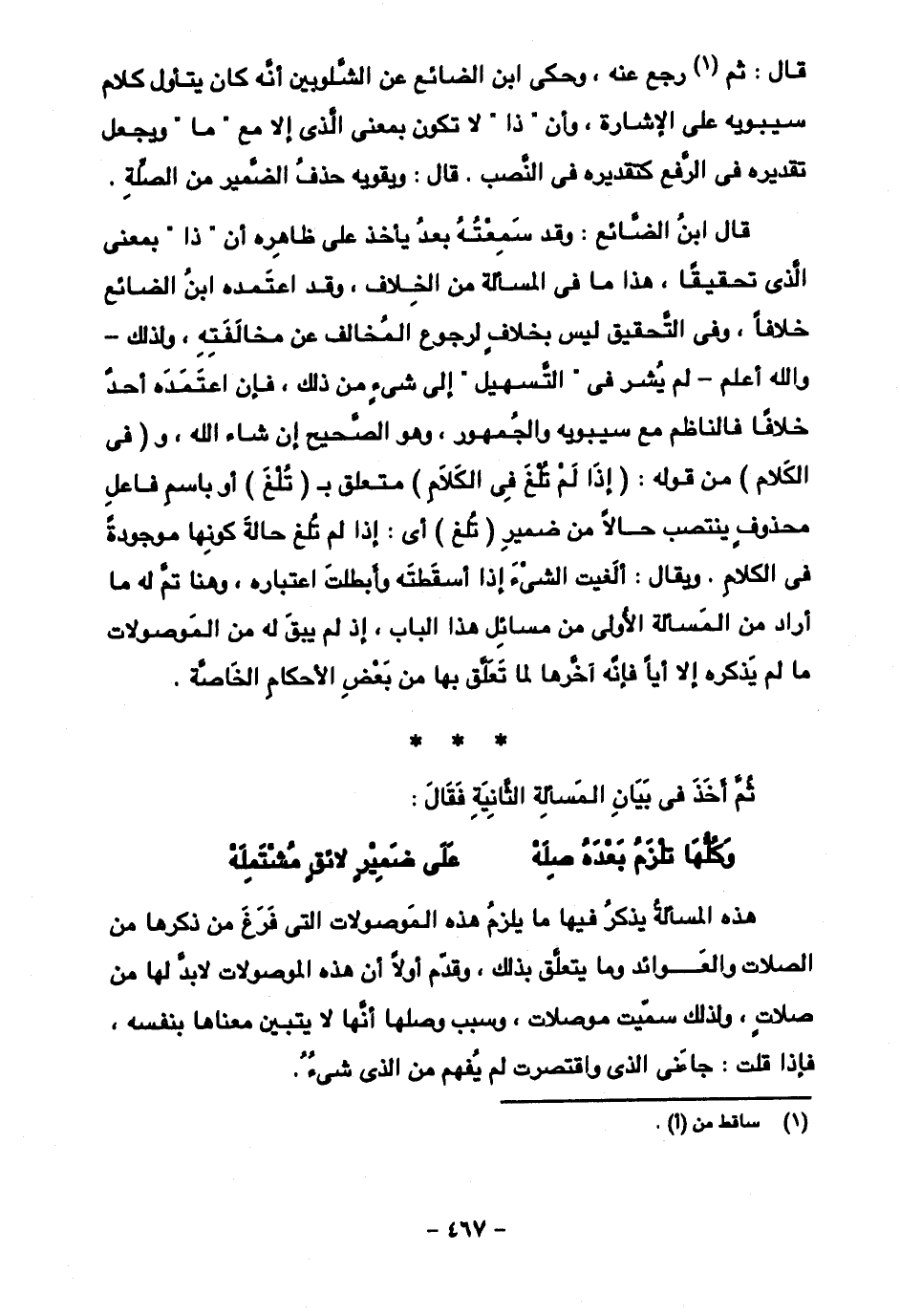 هذه المسألة يذكر فيها ما يلزم هذه الموصولات التي فرغ من ذكرها من الصلات والعوائد وما يتعلق بذلك، وقدم أولا أن هذه الموصلات لابد لها من صلات، ولذلك سميت موصلات، وسبب وصلها أنها لا يتبين معناها بنفسه، فإذا قلت: جاءني الذي واقتصرت لم يفهم من الذي شيء.