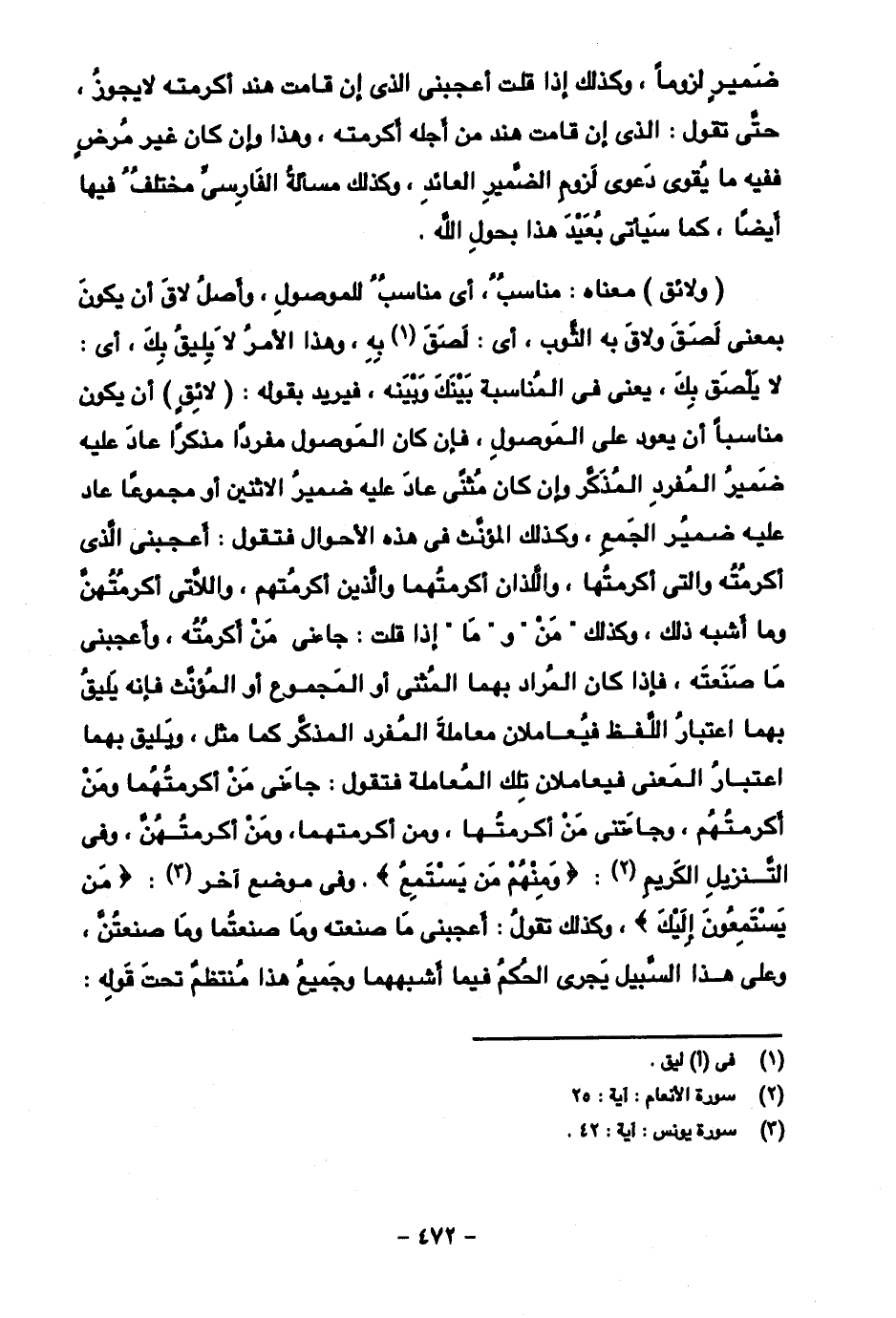 (ولائق) معناه: مناسب، أي مناسب للموصول، وأصل لاق أن يكون بمعنى لصق ولاق به الثوب، أي: لصق به، وهذا الأمر لا يليق بك، أي: لا يلصق بك، يعني في المناسبة بينك وبينه، فيريد بقول: (لائق) أن يكون مناسبا أن يعود على الموصول، فإن كان الموصول مفردا مذكرا عاد عليه ضمير المفرد المذكر وإن كان مثنى عاد عليه ضمير الاثنين أو مجموعا عاد عليه ضمير الجمع، وكذلك المؤنث في هذه الأحوال فتقول: أعجبني الذي أكرمته والتي أكرمتها، واللذان أكرمتهما والذين أكرمتهم، واللاتي أكرمتهن وما أشبه ذلك، وكذلك "من" و "ما" إذا قلت: جاءني من أكرمته، وأعجبني ما صنعته، فإذا كان المراد بهما المثنى أو المجموع أو المؤنث فإنه يليق بهما اعتبار اللفظ فيعاملان معاملة المفرد المذكر كما مثل، ويليق بهما اعتبار المعنى فيعاملان تلك المعاملة فتقول: جاءني من أكرمتهما، وفي التنزيل الكريم، {ومنهم من يستمع}. وفي موضع آخر: {من يستمعون إلي}، وكذلك تقول: أعجبني ما صنعته وما صنعتما وما صنعتن، وعلى هذا السبيل يجرى الحكم فيما أشبههما وجميع هذا منتظم تحت قوله: