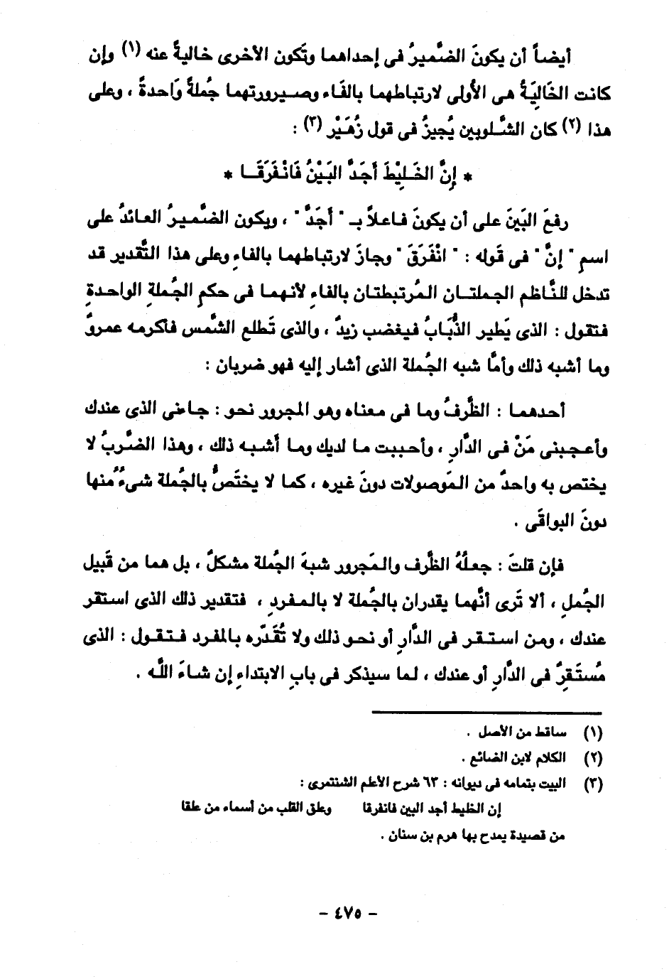 رفع البين على أن يكون فاعلا بـ "أجد"، ويكون الضمير العائد على اسم "إن" في قوله: "انفرق" وجاز لارتباطهما بالفاء وعلى هذا التقدير قد تدخل للناظم الجملتان المرتبطان بالفاء لأنهما في حكم الجملة الواحدة فتقول: الذي يطير الذباب فيغضب زيد، والذي تطلع الشمس فأكرمه عمرو وما أشبه ذلك وأما شبه الجملة الذي أشار إليه فهو ضربان: