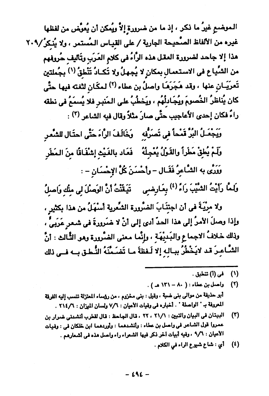 الموضع غير ما ذكر، إذ ما من ضرورة إلا ويمكن أن يعوض من لفظها غيره من الألفاظ الصحيحة الجارية/ على القياس المستمر، ولا ينكر هذا إلا جاحد لضرورة العقل هذه الراء في كلام العرب وتأليف حروفهم من الشياع في الاستعمال بمكان لا يجهل ولا تكاد تنطق بجملتين تعريان عنها، وقد هجرها واصل بن عطاء لمكان لثغته فيها حتى كان يناظر الخصوم ويجادلهم، ويخطب على المنبر فلا يسمع في نطقه راء فكان إحدى الأعاجيب حتى صار مثلا وقال فيه الشاعر: