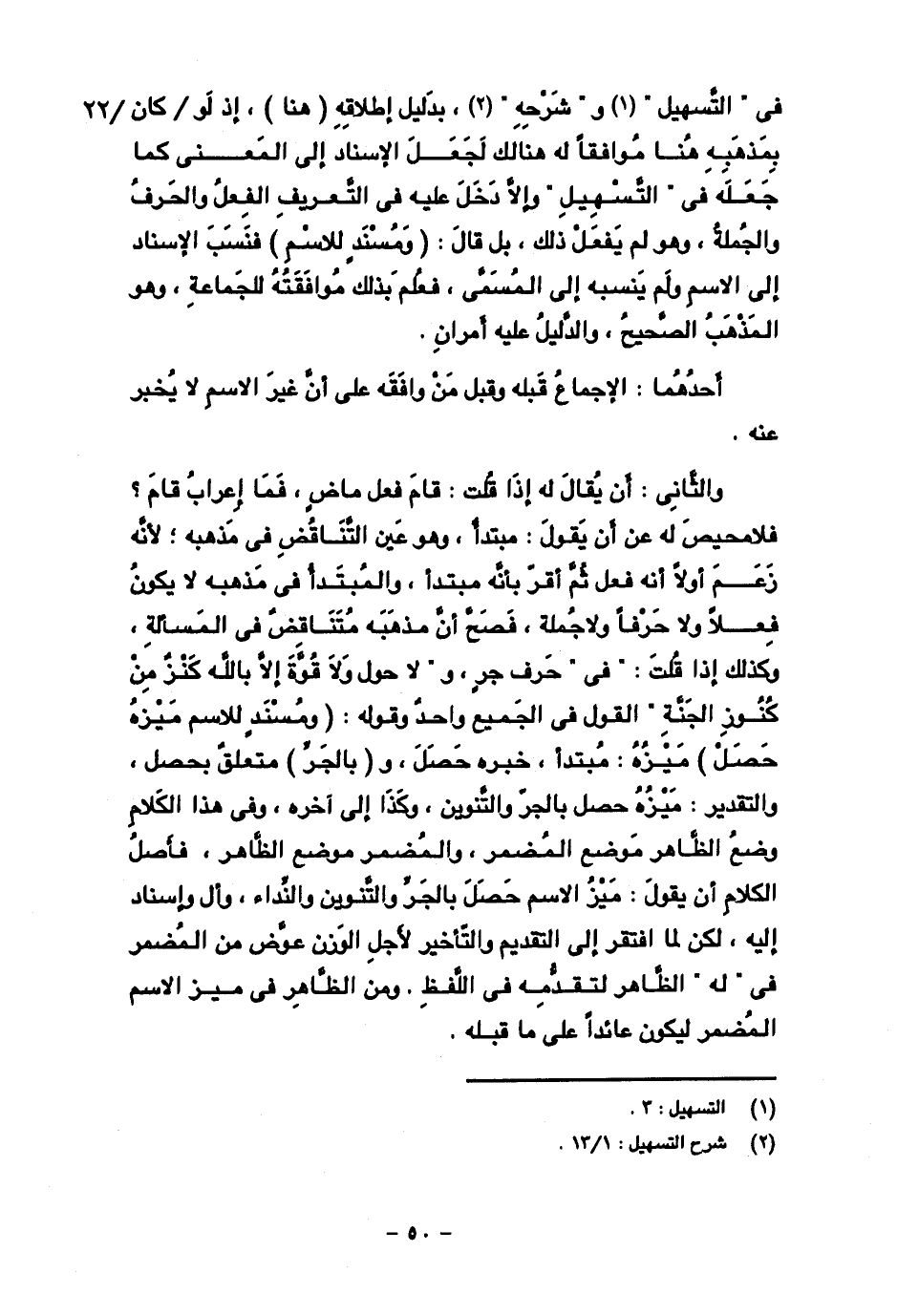 في "التسهيل" و "شرحه" بدليل إطلاقه (هنا)، إذ لو كان بمذهبه هنا موافقا له هنالك لجعل الإسناد إلى المعنى كما جعله في "التسهيل" وإلا دخل عليه في التعريف الفعل والحرف والجملة، وهو لم يفعل ذلك، بل قال: (ومسند للاسم) فنسب الإسناد إلى الاسم ولم ينسبه إلى المسمى، فعلم بذلك موافقته للجماعة، وهو المذهب الصحيح، والدليل عليه أمران.