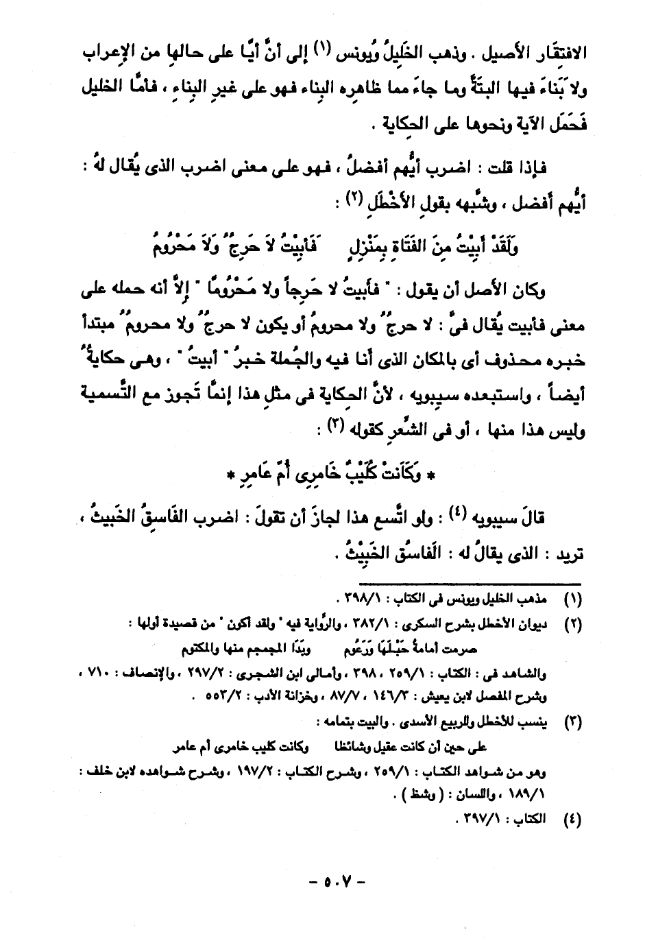 وكان الأصل أن يقول: "فأبيت لا حرجا ولا محروما" إلا أنه حمله على معنى فأبيت يقال في: لا حرج ولا محروم أو يكون لا حرج ولا محروم مبتدأ خبره محذوف أي بالمكان الذي أنا فيه والجملة خبر "أبيت"، وهي حكاية أيضا، واستبعده سيبويه، لأن الحكاية في مثل هذا إنما تجوز مع التسمية وليس هذا منها، أو في الشعر كقوله:
