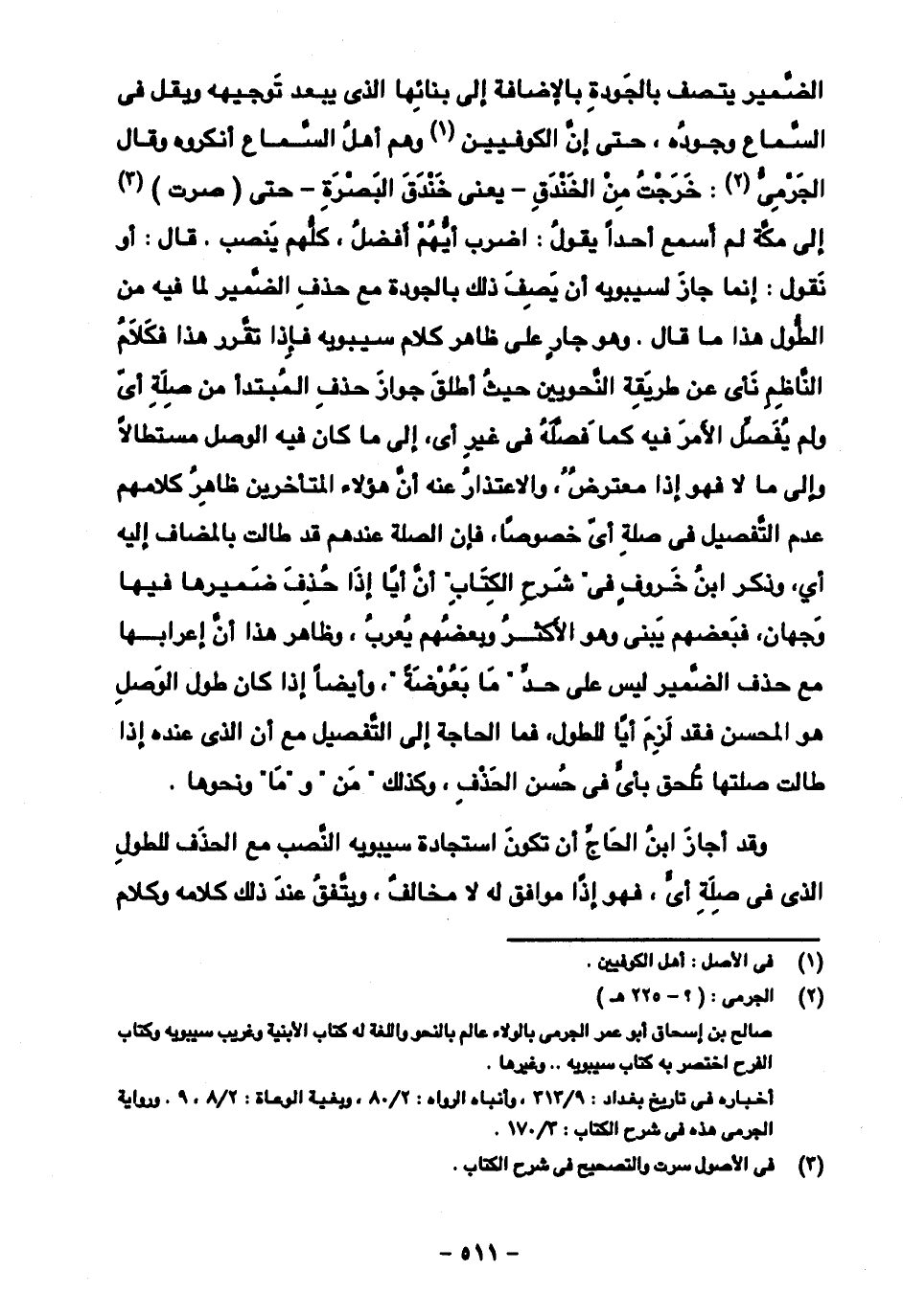 الضمير يتصف بالجودة بالإضافة إلى بنائها الذي يبعد توجيهه ويقل في السماع وجوده، حتى إن الكوفيين وهم أهل السماع أنكروه وقال الجرمي: خرجت من الخندق- يعني خندق البصرة- حتى (صرت) إلى مكة لم أسمع أحدا يقول: اضرب أيهم فضل، كلهم ينصب. قال: أو نقول: إنما جاز لسيبويه أن يصف ذلك بالجودة مع حذف الضمير لما فيه من الطول هذا ما قال. وهو جار على ظاهر كلام سيبويه فإذا تقرر هذا فكلام الناظم نأى عن طريقة النحويين حيث أطلق جواز حذف المبتدأ من صلة أي ولم يفصل الأمر فيه كما فصله في غير أي، إلى ما كان فيه الوصل مستطالا وإلى ما لا فهو إذا معترض، والاعتذار عنه أن هؤلاء المتأخرين ظاهر كلامهم عدم التفصيل في صلة أي خصوصا، فإن الصلة عندهم قد طالت بالمضاف إليه أي، وذكر ابن خروف في "شرح الكتاب" أن أيا إذا حذف ضميرها فيها وجهان، فبعضهم يبنى وهو الأكثر وبعضهم يعرب، وظاهر هذا أن إعرابها مع حذف الضمير ليس على حد "ما بعوضة"، وأيضا إذا كان طول الوصل هو المحسن فقد لزم أيا للطول، فما الحاجة إلى التفصيل مع أن الذي عنده إذا طالت صلتها تلحق بأي في حسن الحذف، وكذلك "من" و "ما" ونحوها.