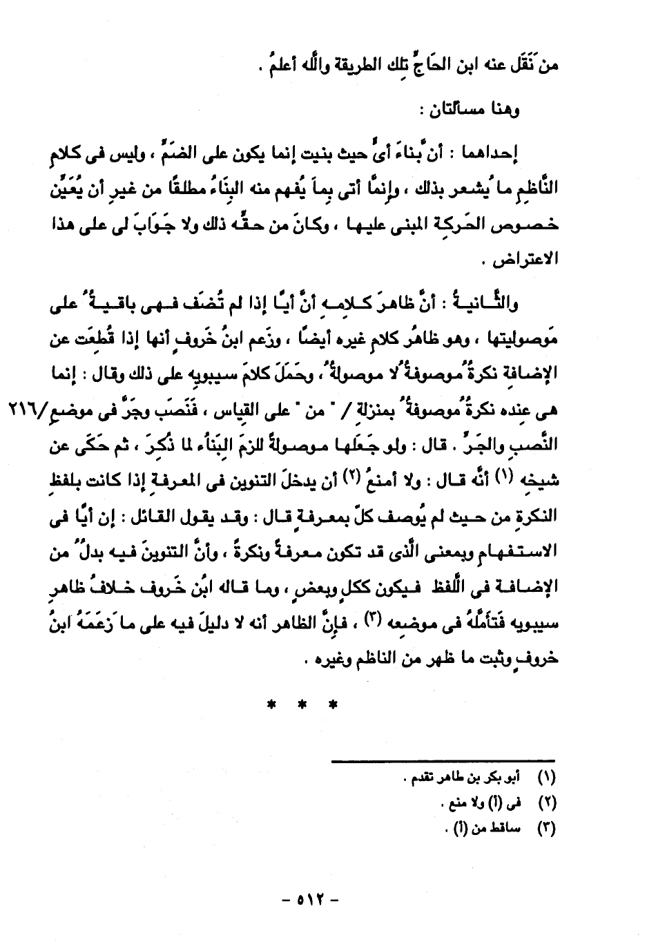 إحداهما: أن بناء أي حيث بنيت إنما يكون على الضم، وليس في كلام الناظم ما يشعر بذلك، وإنما أتى بما يفهم منه البناء مطلقا من غير أن يعين خصوص الحركة المبنى عليها، وكان من حقه ذلك ولا جواب لي على هذا الاعتراض.