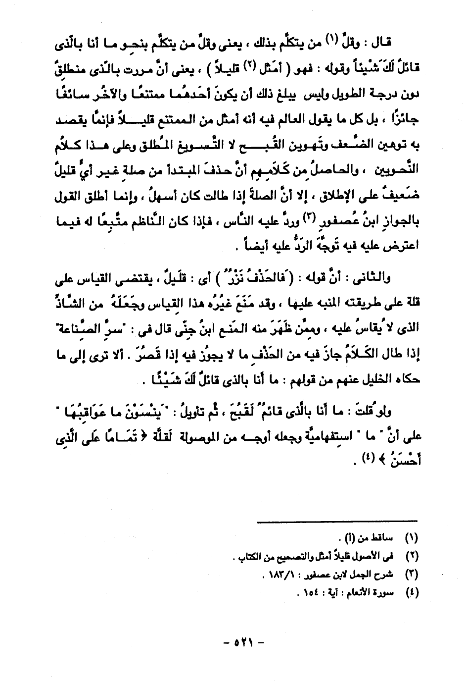 والثاني: أن قوله: (فالحذف نزر) أي: قليل، يقتضى القياس على قلة على طريقته المنبه عليها، وقد منع غيره هذا القياس وجعله من الشاذ الذي لا يقاس عليه، وممن ظهر منه المنع ابن جنى قال في: "سر الصناعة" إذا طال الكلام جاز فيه من الحذف ما لا يجوز فيه إذا قصر. ألا ترى إلى ما حكاه الخليل عنهم من قولهم: ما أنا بالذي قائل لك شيئا.