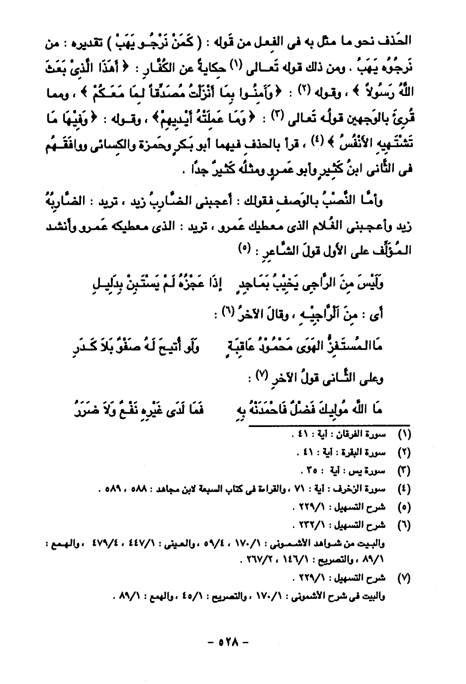 الحذف نحو ما مثل به في الفعل من قوله: (كمن نرجو يهب) تقديره: من نرجوه يهب. ومن ذلك قوله تعالى حكاية عن الكفار {أهذا الذي بعث الله رسولا}، وقوله: {وآمنوا بما أنزلت مصدقا لما معكم}، ومما قرئ بالوجهين قوله تعالى: {وما عملته أيديهم}، وقوله: {وفيها ما تشتهيه الأنفس}، قرأ بالحذف فيهما أبو بكر وحمزة والكسائي ووافقهم في الثاني ابن كثير وأبو عمرو ومثله كثير جدا.