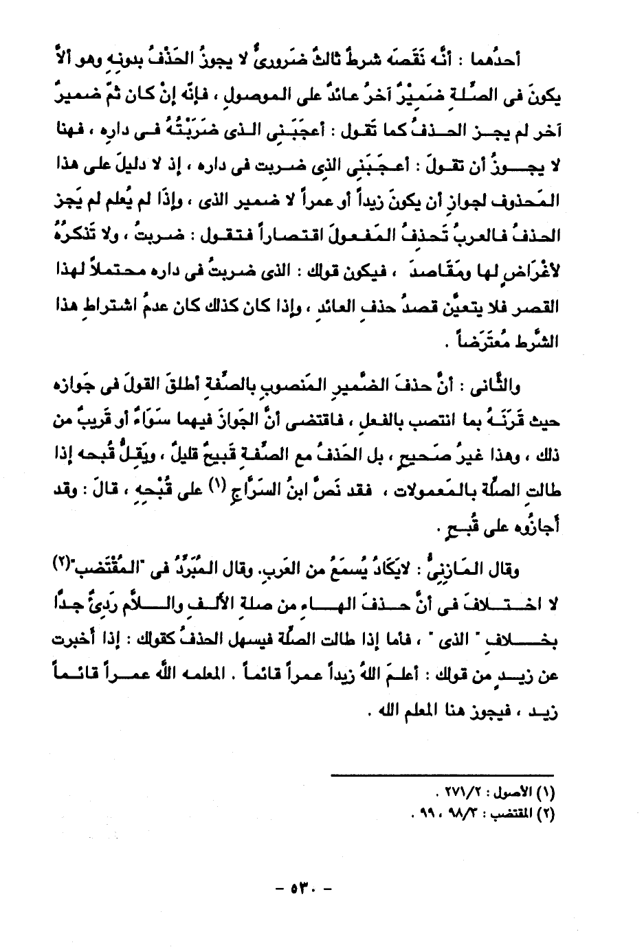 أحدهما: أنه نقصه شرط ثالث ضروري لا يجوز الحذف بدونه وهو ألا يكون في الصلة ضمير آخر عائد على الموصول، فإنه إن كان ثم ضمير آخر لم يجز الحذف كما تقول: أعجبني الذي ضربته في داره، فهنا لا يجوز أن تقول: أعجبني الذي ضربت في داره، إذ لا دليل على هذا المحذوف لجواز أن يكون زيدا أو عمرا لا ضمير الذي، وإذا لم يعلم لم يجز الحذف فالعرب تحذف المفعول اقتصارا فتقول: ضربت، ولا تذكره لأغراض لها ومقاصد، فيكون قولك: الذي ضربت في داره محتملا لهذا القصر فلا يتعين قصد حذف العائد، وإذا كان كذلك كان عدم اشتراط هذا الشرط معترضا.