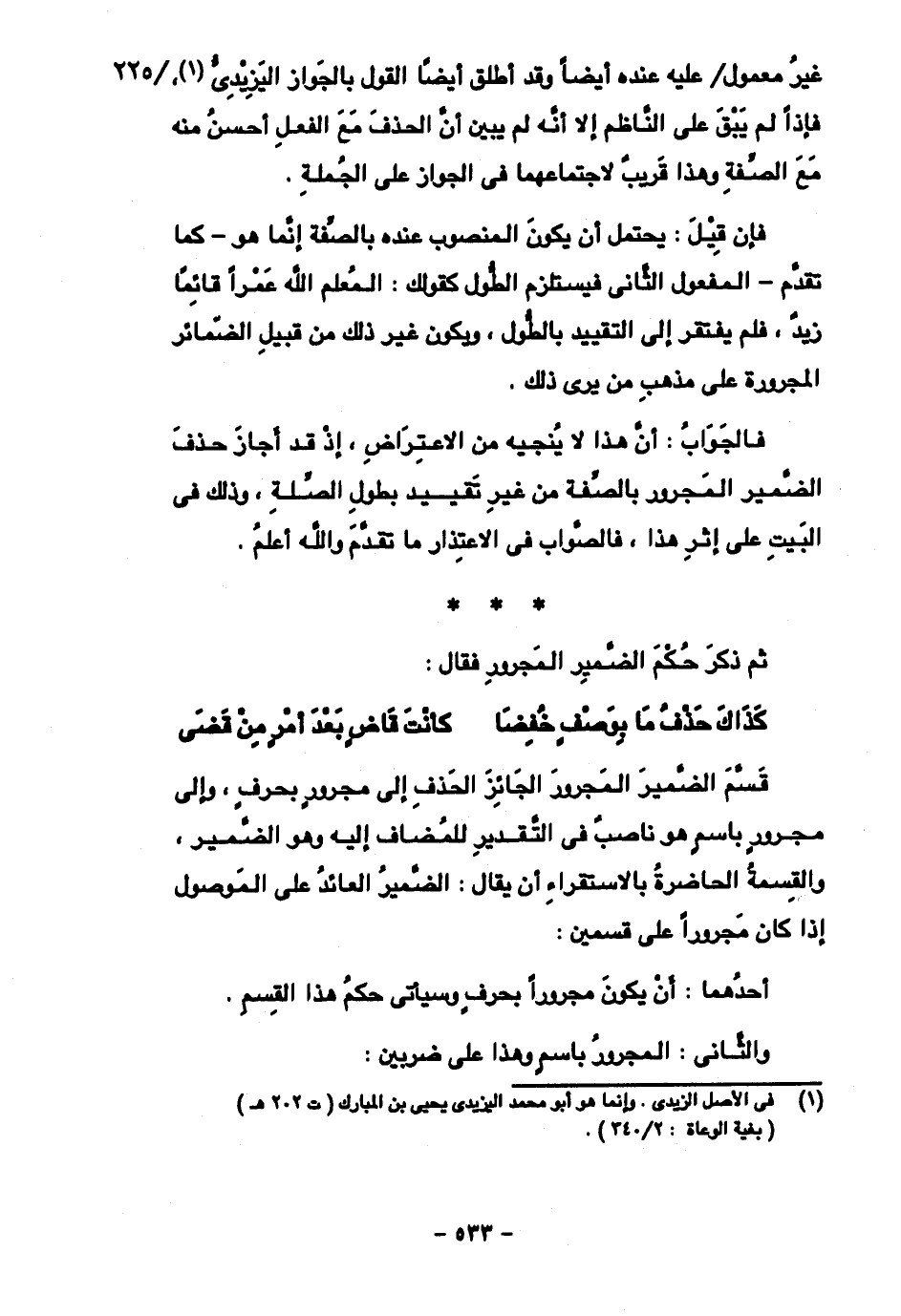 فإن قيل: يحتمل أن يكون المنصوب عنده بالصفة إنما هو- كما تقدم- المفعول الثاني فيستلزم الطول كقولك: المعلم الله عمرا قائما زيد، فلم يفتقر إلى التقييد بالطول، ويكون غير ذلك من قبيل الضمائر المجرورة على مذهب من يرى ذلك.