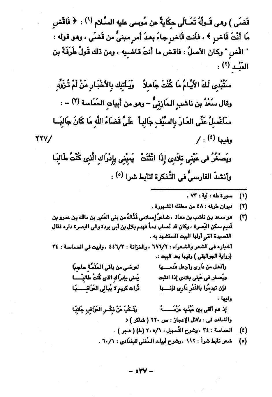 قضى) وهي قوله تعالى حكاية عن موسى عليه السلام: {فاقض ما أنت قاض}، فأنت قاض جاء بعد أمر مبنى من قضية، وهو قوله: "اقض" وكان الأصل: فاقض ما أنت قاضيه، ومن ذلك قول طرفة بن العبد: