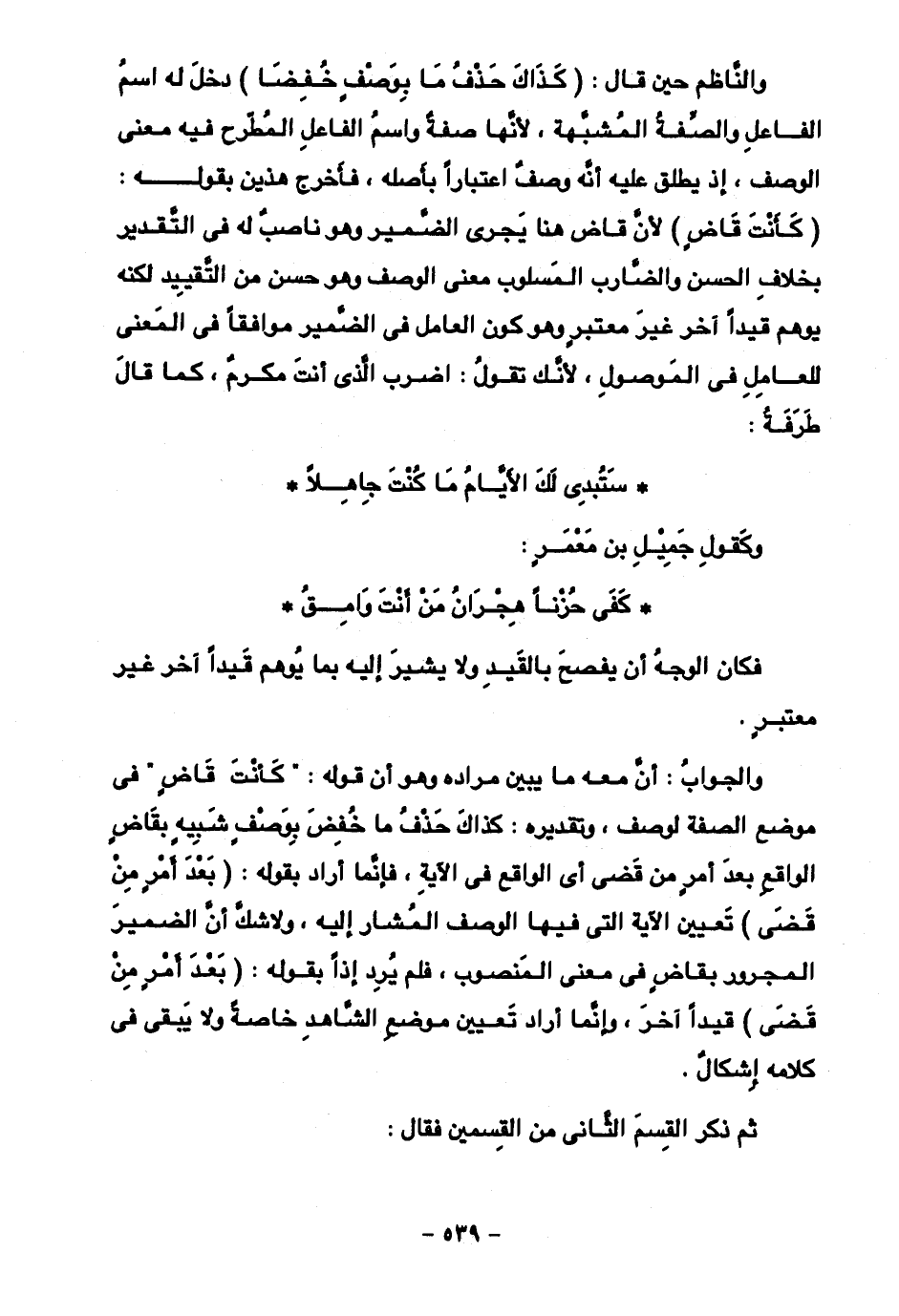 والجواب: أن معه ما يبين مراده وهو أن قوله: "كأنت قاض" في موضع الصفة لوصف، وتقديره: كذاك حذف ما خفض بوصف شبيه بقاض الواقع بعد أمر من قضى أي الواقع الآية، فإنما أراد بقوله: (بعد أمر من قضى) تعيين الآية التي فيها الوصف المشار إليه، ولا شك أن الضمير المجرور بقاض في معنى المنصوب، فلم يرد إذا بقوله: (بعد أمر من قضى) قيدا آخر، وإنما أراد تعيين موضع الشاهد خاصة ولا يبقى في كلامه إشكال.