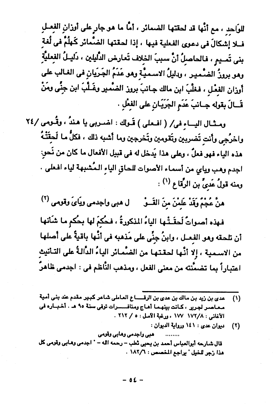 ومثال الياء في (افعلى) قولك: اضربي يا هند، وقومي واخرجي، وأنت تضربين وتقومين وتخرجين وما أشبه ذلك، فكلّ ما لحقته هذه الياء فهو فعل، وعلى هذا يدخل له من قبيل الأفعال ما كان من نحو: أجدم وهب وياي من أسماء الأصوات للحاق الياء المشبهة لياء افعلي، ومنه قول عدي بن الرقاع: