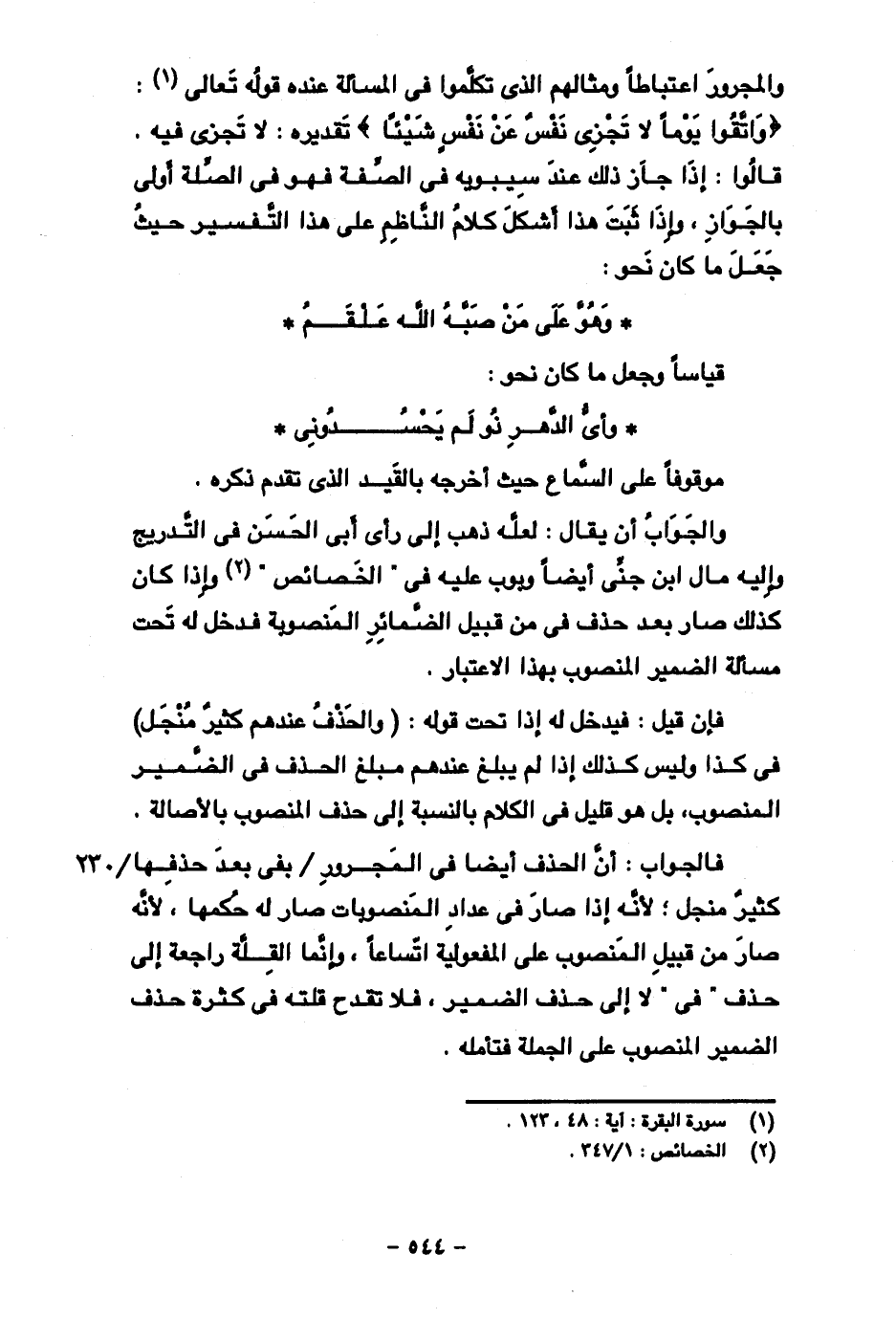 والمجرور اعتباطا ومثالهم الذي تكلموا في المسألة عنده قوله تعالى: {واتقوا وما ما لا تجزى نفس عن نفس شيئا} تقديره: لا تجزى فيه. قالوا: إذا جاز ذلك عند سيبويه في الصفة فهو في الصلة أولى بالجواز، وإذا ثبت هذا أشكل كلام الناظم على هذا التفسير حيث جعل ما كان نحو: