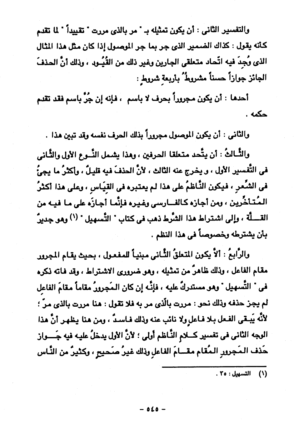 والتفسير الثاني: أن يكون تمثيله بـ "مر بالذي مررت "تقييدا" لما تقدم كأنه يقول: كذاك الضمير الذي جر بما جر الموصول إذا كان مثل هذا المثال الذي وجد فيه اتحاد متعلقى الجارين وغير ذلك من القيود، وذلك أن الحذف الجائز جوازا حسنا مشروط بأربعة شروط: