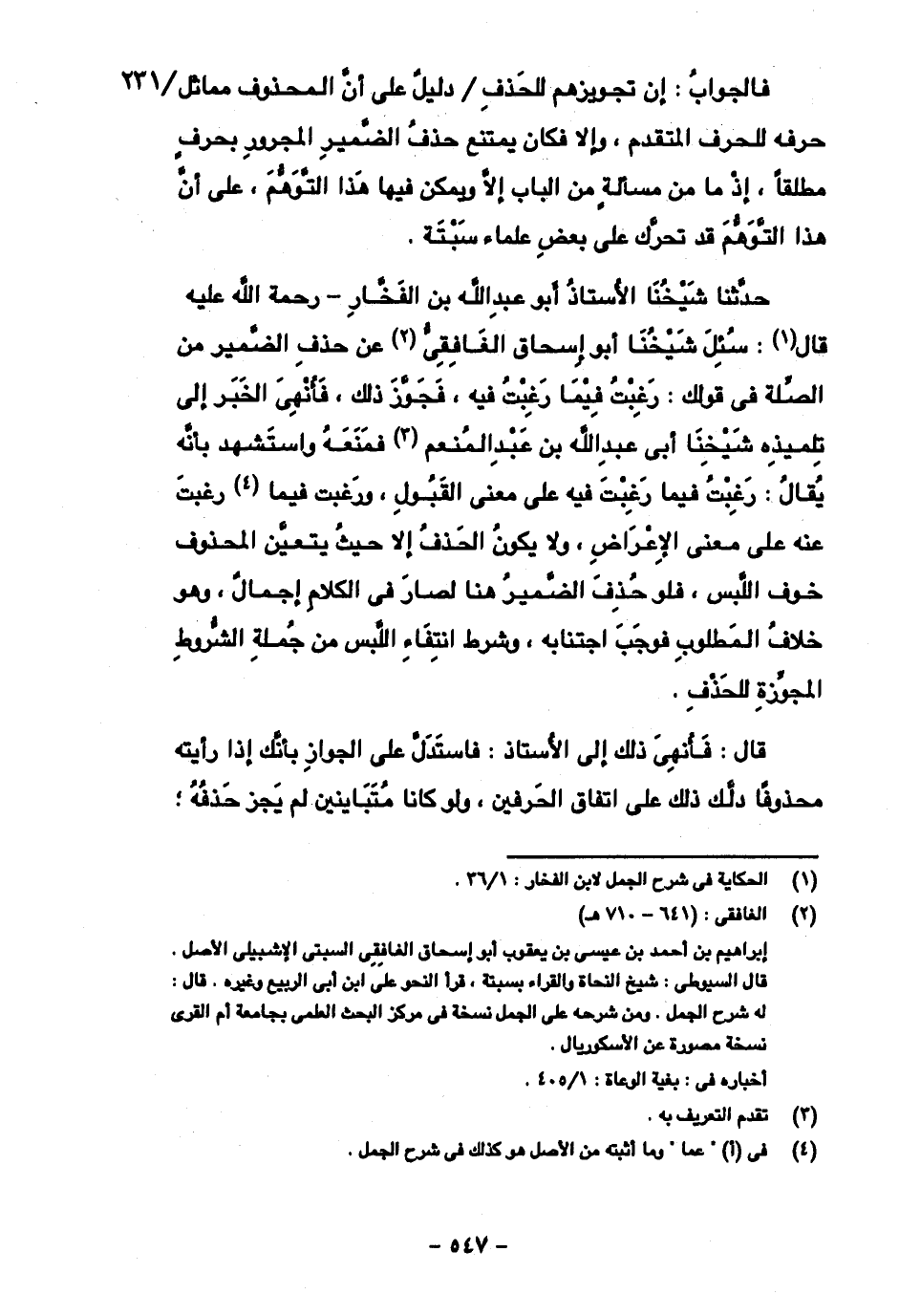 حدثنا شيخنا الأستاذ أبو عبد الله بن الفخار- رحمة الله عليه قال: سئل شيخنا أبو إسحاق الغافقي عن حذف الضمير من الصلة في قولك: رغبت فيما رغبت فيه، فجوز ذلك، فأنهى الخبر إلى تلميذه شيخنا أبي عبد الله بن عبد المنعم فمنعه واستشهد بأنه يقال: رغبت فيما رغبت فيه على معنى القبول، ورغبت فيما رغبت عنه على معنى الإعراض، ولا يكون الحذف إلا حيث يتعين المحذوف خوف اللبس، فلو حذف الضمير هنا لصار في الكلام إجمال، وهو خلاف المطلوب فوجب اجتنابه، وشرط انتفاء اللبس من جملة الشروط المجوزة للحذف.