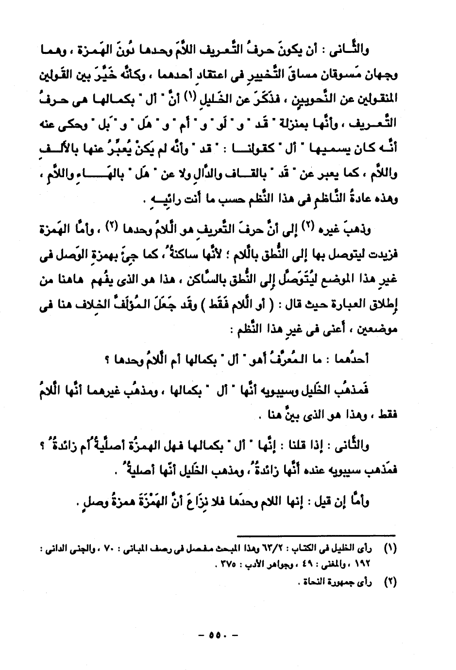 والثاني: أن يكون حرف التعريف اللام وحدا دون الهمزة، وهما وجهان مسوقان مساق التخيير في اعتقاد أحدهما، وكأنه خير بين القولين المنقولين عن النحويين، فذكر عن الخليل أن "أل" بكمالها هي حرف التعريف، وأنها بمنزلة "قد" و "لو" و "هل" و "بل" وحكي عنه أنه كان يسميها "أل" كقولنا: "قد" وأنه لم يكن يعبر عنها بالألف واللام، كما يعبر عن "قد" بالقاف والدال ولا عن "هل" بالهاء واللام، وهذه عادة الناظم في هذا النظم حسب ما أنت رائيه.