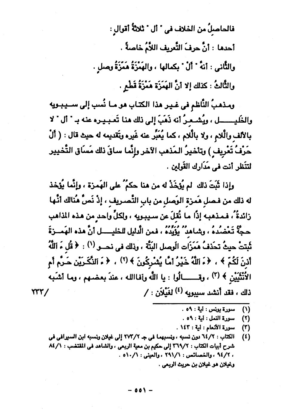 وإذا ثبت ذلك لم يؤخذ من هنا حكم على الهمزة، وإنما يؤخذ له ذلك من فصل همزة الوصل من باب التصريف، إذ نص هنالك أنها زائدة، فمذهبه إذا ما نقل عن سيبويه، ولكل واحد من هذه المذاهب حجة تعضده، وشاهد يؤيده، فمن الدليل للخليل أن هذه الهمزة ثبتت حيث تحذف همزات الوصل البتة، وذلك في نحو {قلء الله أذن لكم}، {ء الله خير أما يشركون}، {ء آلذكرين حرم أم الأنثيين}، وقالوا: يا الله وآفا الله، عند بعضهم، وما أشبه ذلك، فقد أنشد سيبويه لغيلان: /