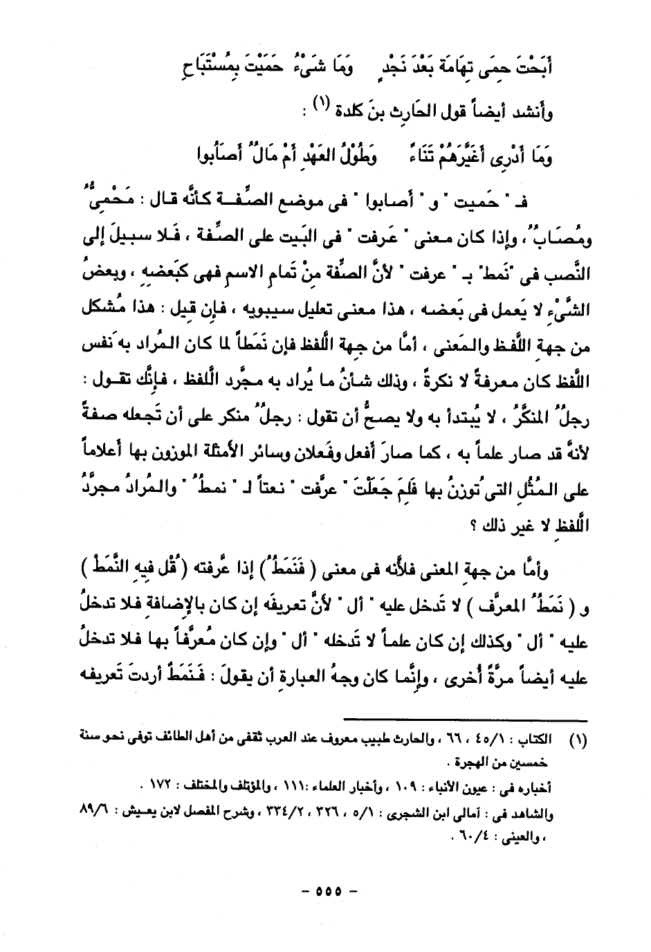 فـ "حميت" و "أصابوا" في موضع الصفة كأنه قال: محمى ومصاب، وإذا كان معنى "عرفت" في البيت على الصفة، فلا سبيل إلى النصب في "نمط" بـ "عرفت" لأن الصفة من تمام الاسم فهي كبعضه، وبعض الشيء لا يعمل في بعضه، هذا معنى تعليل سيبويه، فإن قيل: هذا مشكل من جهة اللفظ والمعنى، أما من جهة اللفظ فإن نمطا لما كان المراد به نفس اللفظ كان معرفة لا نكرة، وذلك شأن ما يراد به مجرد اللفظ، فإنك تقول: رجل المنكر، لا يبتدأ به ولا يصح أن تقول: رجل منكر على أن تجعله صفة لأنه قد صار علما به، كما صار أفعل وفعلان وسائر الأمثلة الموزونة بها أعلاما على المثل التي توزن بها فلم جعلت "عرفت" نعتا لـ "نمط" والمراد مجرد اللفظ لا غير ذلك؟