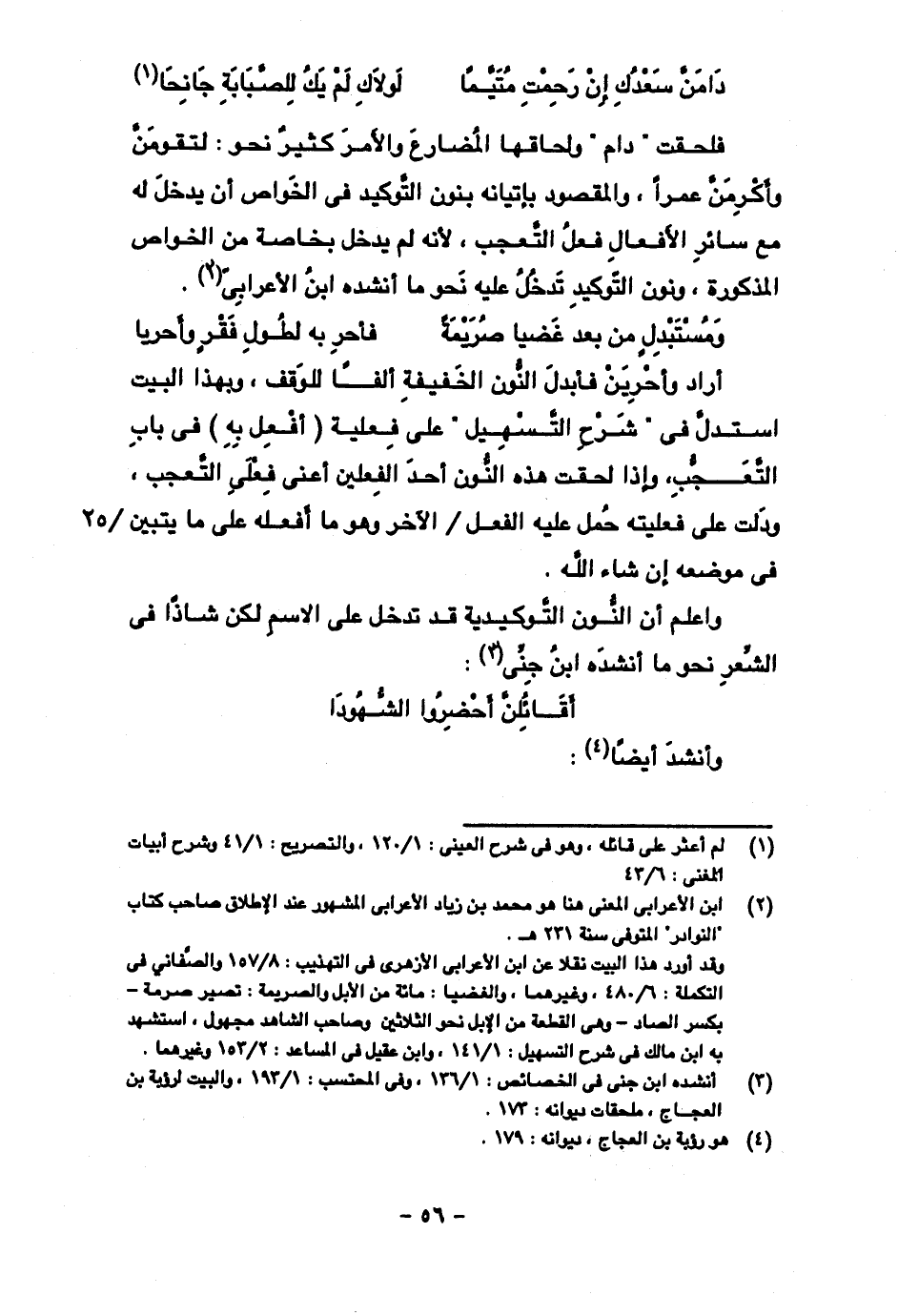 فلحقت "دام" ولحاقها المضارع والأمر كثير نحو: لتقومن وأكرمن عمرا، والمقصود بإتيانه بنون التوكيد في الخواص أن يدخل له مع سائر الأفعال فعل التعجب، لأنه لم يدخل بخاصة من الخواص المذكورة، ونون التوكيد تدخل عله نحو ما أنشده ابن الأعرابي: