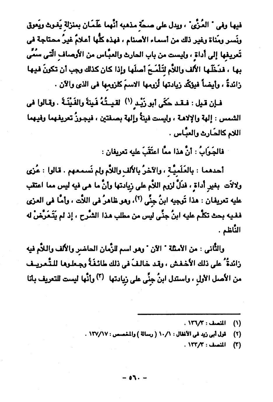 فيها وفي "العزى" ويدل على صحة مذهبه أنهما علمان بمنزلة يغوث ويعوق ونسر ومناة وغير ذلك من أسماء الأصنام، فهذه كلها أعلام غير محتاجة في تعريفها إلى أداة، وليست من باب الحارث والعباس من الأوصاف التي سمي بها، فدخلها الألف واللام لتلمح أصلها وإذا كان كذلك وجب أن تكون فيها زائدة، وأيضا فيؤكد زيادتها لزومها الاسم كلزومها في الذي والآن.