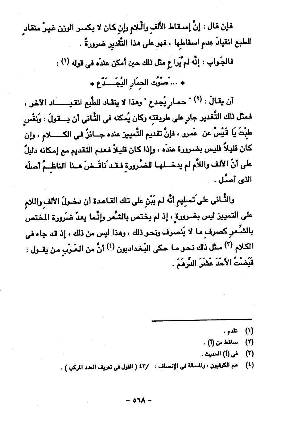 فإن قال: إن إسقاط الألف واللام وإن كان لا يكسر الوزن غير منقاد للطبع انقياد عدم إسقاطها، فهو على هذا التقدير ضرورة.