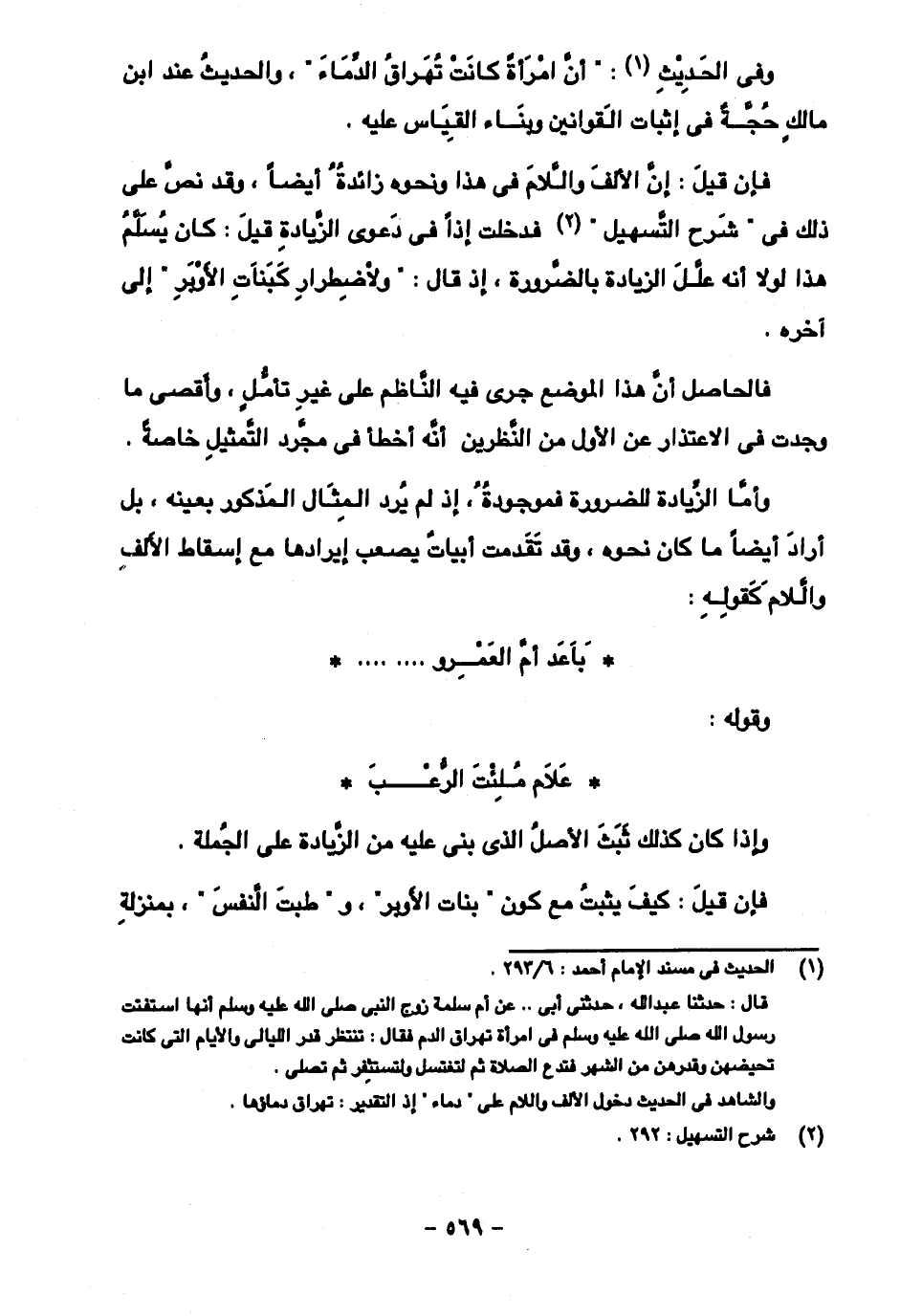 وفي الحديث: "أن امرأة كانت تهراق الدماء"، والحديث عند ابن مالك حجة في إثبات القوانين وبناء القياس عليه.