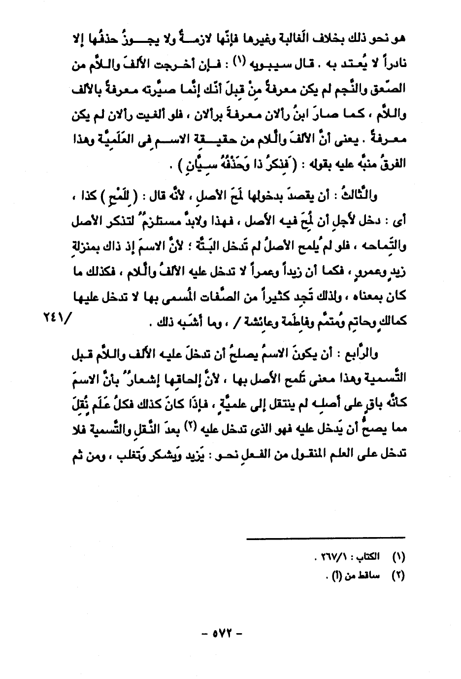هو نحو ذلك بخلاف الغالبة وغيرها فإنها لازمة ولا يجوز حذفها إلا نادرا لا يعتد به. قال سيبويه: فإن أخرجت الألف واللام من الصعق والنجم لم يكن معرفة من قبل أنك إنما صيرته معرفة بالألف واللام، كما صار ابن رألان معرفة برألان، فلو ألغيت رألان لم يكن معرفة. يعني أن الألف واللام من حقيقة الاسم في العلمية وهذا الفرق منبه عليه بقوله: (فذكر ذا وحذفه سيان).