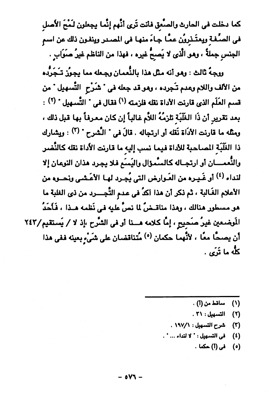 ووجه ثالث: وهو أنه مثل هذا بالنعمان وجعله مما يجوز تجرده من الألف واللام وعدم تجرده، وهو قد جعله في "شرح التسهيل" من قسم العلم الذي قارنت الأداة نقله فلزمته فقال في "التسهيل": بعد تقرير أن ذا الغلبة تلزمه اللام غالبا إن كان معرفا بها قبل ذلك، ومثله ما قارنت الأداة نقله أو ارتجاله. قال في "الشرح": ويشارك ذا الغلبة المصاحبة للأداة فيما نسب إليه ما قارنت الأداة نقله كالنضر والنعمان أو ارتجاله كالسموأل واليسع فلا يجرد هذان النوعان إلا لنداء أو غيره من العوارض التي يجرد لها الأعشى ونحوه من الأعلام الغالبة، ثم ذكر أن هذا آكد في عدم التجرد من ذي الغلبة ما هو مسطور هنالك، وهذا مناقض لما نص عليه في نظمه هذا، فأحد الموضعين غير صحيح، إما كلامه هنا أو في الشرح، إذ لا/ يستقيم أن يصحا معا، لأنهما حكمان متناقضان على شيء بعينه ففي هذا كله ما ترى.