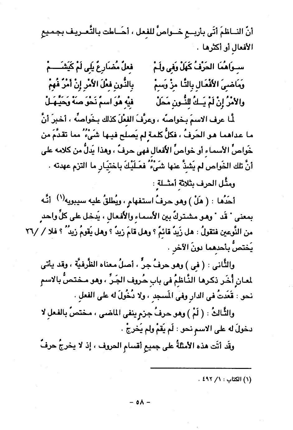 والثاني: (في) وهو حرف جر، اصل معناه الظرفية، وقد يأتي لمعان أُخر ذكرها الناظم في باب حروف الجر، وهو مختص بالاسم نحو: قعدت في الدار وفي المسجد، ولا دخول له على الفعل.