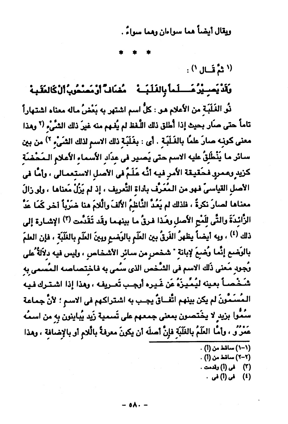 ذو الغلبة من الأعلام هو: كل اسم اشتهر به بعض ماله معناه اشتهارا تاما حتى صار بحيث إذا أطلق ذلك اللفظ لم يفهم منه غير ذلك الشيء (وهذا معنى كونه صار علما بالغلبة. أي: بغلبة ذلك الاسم لذلك الشيء) من بين سائر ما ينطلق عليه الاسم حتى يصير في عداد الأسماء الأعلام المحضة كزيد وعمرو فحقيقة الأمر فيه أنه علم في الأصل الاستعمالي، وأما في الأصل القياسي فهو من المعرف بأداة التعريف، إذ لم يزل معناها، ولو زال معناها لصار نكرة، فلذلك لم يعد الناظم الألف واللام هنا ضربا آخر كما عد الزائدة والتي للمح الأصل وهذا فرق ما بينهما وقد تقدمت الإشارة إلى ذلك، وبه أيضا يظهر الفرق بين العلم بالوضع وبين العلم بالغلبة، فإن العلم بالوضع إنما وضع لإبانة "شخص من سائر الأشخاص، وليس فيه دلالة على وجود معنى ذلك الاسم في الشخص الذي سمى به فاختصاصه المسمى به شخصا بعينه ليميزه عن غيره أوجب تعريفه، وهذا إذا اشترك فيه المسمون لم يكن بينهم اتفاق يجب به اشتراكهم في الاسم؛ لأن جماعة سموا بزيد لا يختصون بمعنى جمعهم على تسمية زيد يباينون به من اسمه عمرو، وأما العلم بالغلبة فإن أصله أن يكون معرفة باللام أو بالإضافة، وهذا