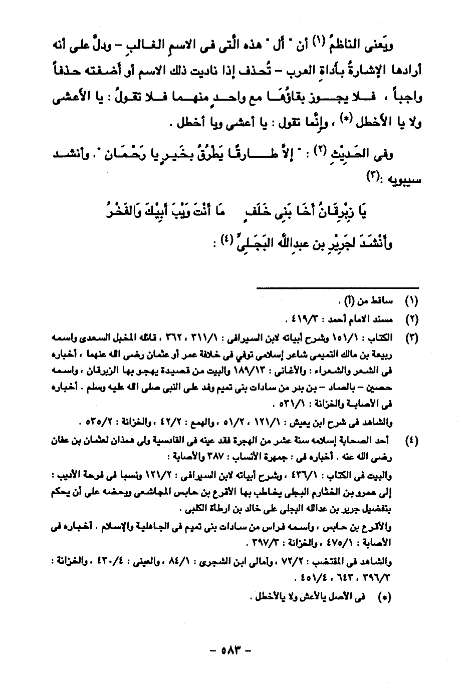 ويعني الناظم أن "أل" هذه التي في الاسم الغالب- ودل على أنه أرادها الإشارة بأداة العرب- تحذف إذا ناديت ذلك الاسم أو أضفته حذفا واجبا، فلا يجوز بقاؤها مع واحد منهما فلا تقول: يا الأعشى ولا يا الأخطل، وإنما تقول: يا أعشى ويا أخطل.