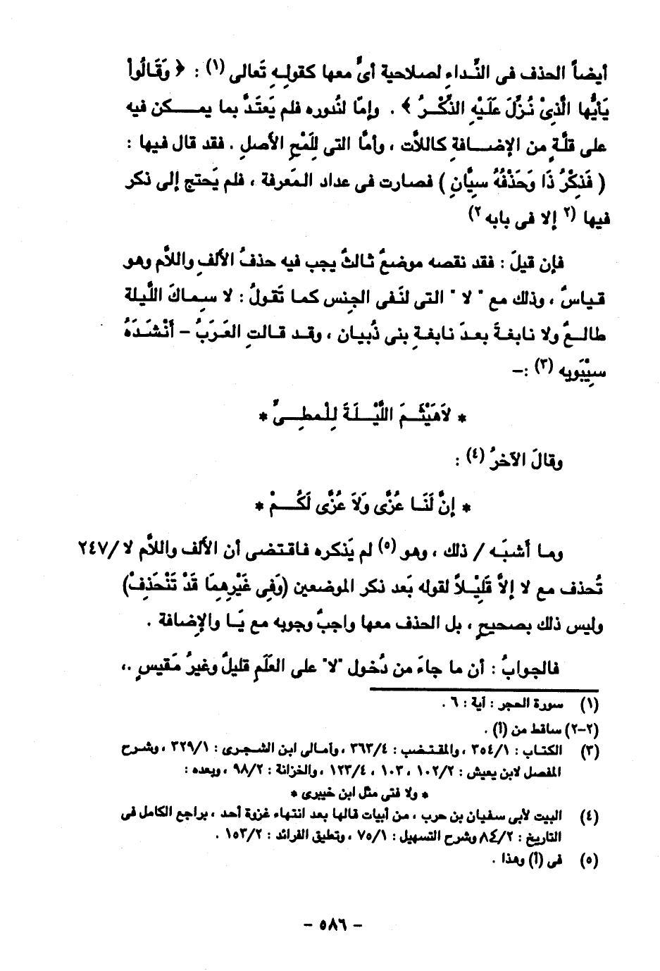 أيضاً الحذف في النداء لصلاحية أي معها كقوله تعالى: {وقالوا يأيها الذي نزل عليه الذكر}. وإما لندوره فلم يعتد بما يمكن فيه على قلة من الإضافة كاللات، وأما التي للمح الأصل. فقد قال فيها: (فذكر ذا وحذفه سيان) فصارت في عدا المعرفة، فلم يحتج إلى ذكر فيها (إلا في بابه)
