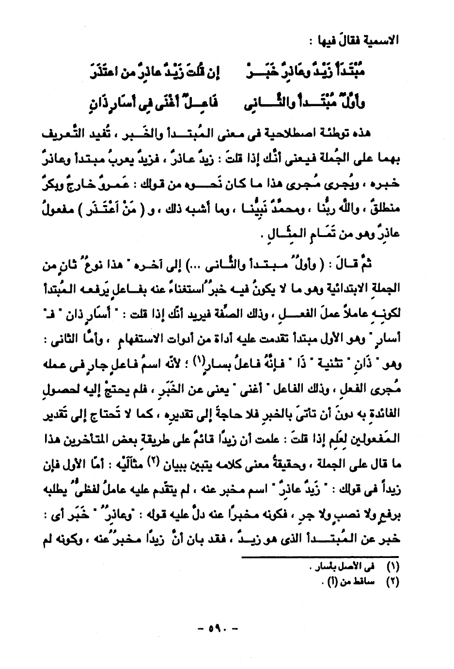 ثم قال: (وأول مبتدأ والثاني ... ) إلى آخره "هذا نوع ثان من الجملة الابتدائية وهو ما لا يكون فيه خبر استغناء عنه بفاعل يرفعه المبتدأ لكونه عاملا عمل الفعل، وذلك الصفة فيريد أنك إذا قلت: "أسار ذان "فـ" أسار" وهو الأول مبتدأ تقدمت عليه أداة من أدوات الاستفهام، وأما الثاني: وهو "ذان" تثنية "ذا" فإنه فاعل بسار؛ لأنه اسم فاعل جار في عمله مجرى الفعل، وذلك الفاعل "أغنى" يعني عن الخبر، فلم يحتج إليه لحصول الفائدة به دون أن تأتي بالخبر فلا حاجة إلى تقديره، كما لا تحتاج إلى تقدير المفعولين لعلم إذا قلت: علمت أن زيدا قائم على طريقة بعض المتأخرين هذا ما قال على الجملة، وحقيقة معنى كلامه يتبين ببيان مثاليه: أما الأول فإن زيدا في قولك: "زيد عاذر" اسم مخبر عنه، لم يتقدم عليه عامل لفظي يطلبه برفع ولا نصب ولا جر، فكونه مخبرا عنه دل عليه قوله: "وعاذر" خبر أي: خبر عن المبتدأ الذي هو زيد، فقد بان أن زيدا مخبر عنه، وكونه لم