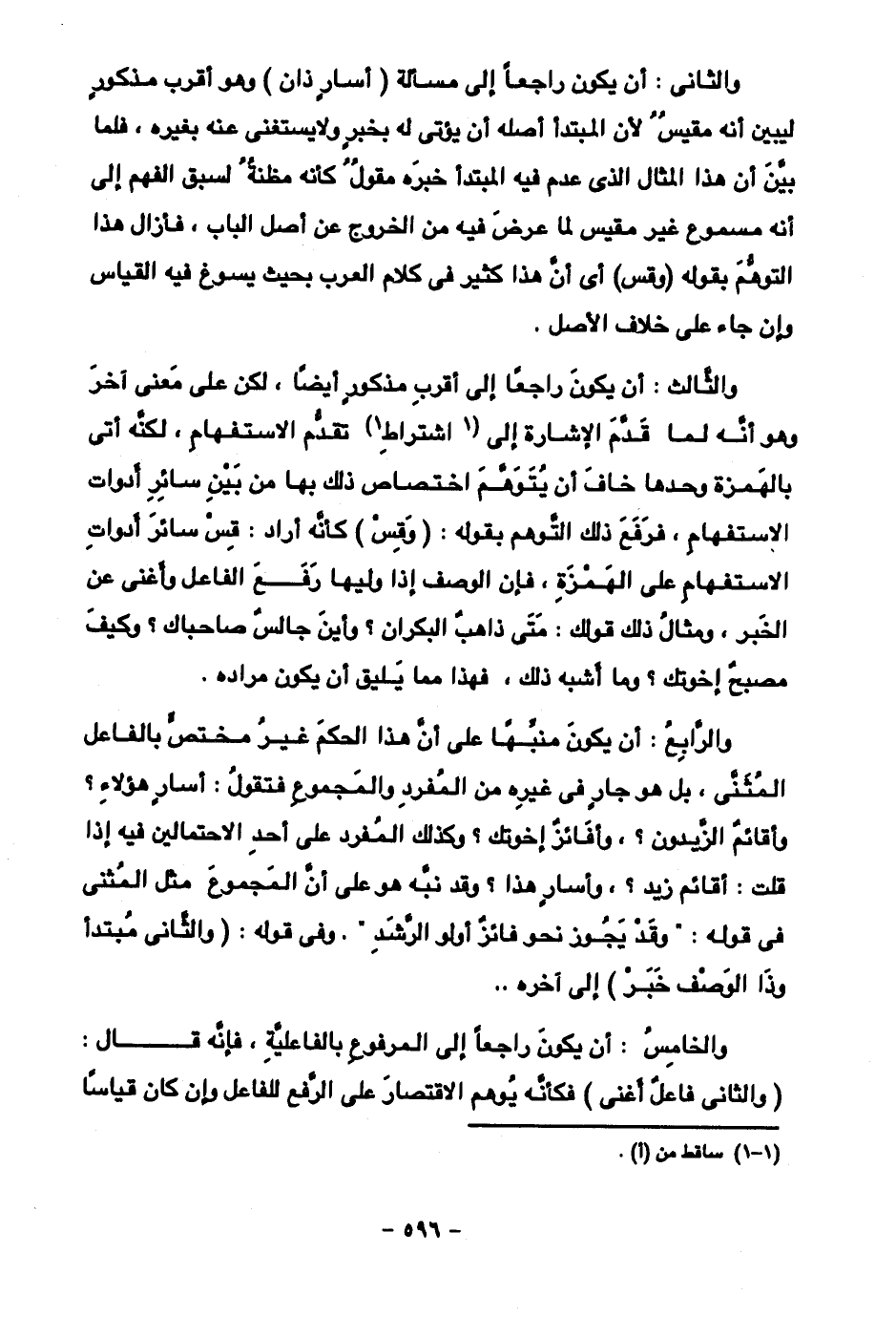والرابع: أن يكون منبها على أن هذا الحكم غير مختص بالفاعل المثنى، بل هو جار في غيره من المفرد والمجموع فتقول: أسار هؤلاء؟ وأقائم الزيدون؟ ، وأفائز إخوتك؟ وكذلك المفرد على أحد الاحتمالين فيه إذا قلت: أقائم زيد؟ ، وأسار هذا؟ وقد نبه هو على أن المجموع مثل المثنى في قوله: "وقد يجوز نحو فائز أولو الرشد". وفي قوله: (والثاني مبتدأ وذا الوصف خبر) إلى آخره ..