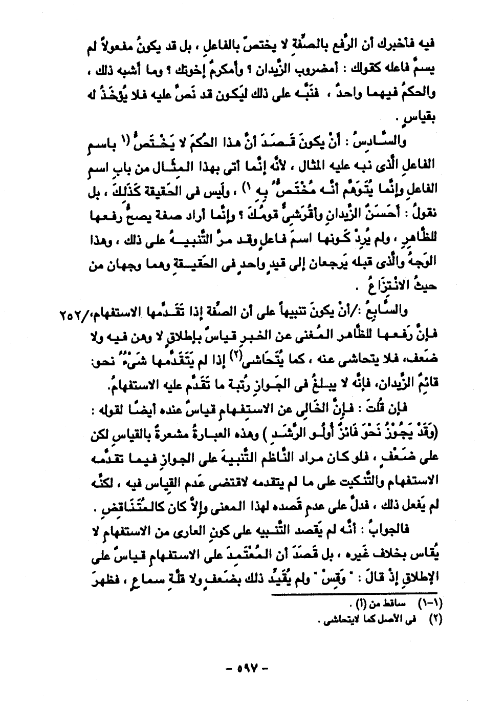 والسابع: /أن يكون تنبيها على أن الصفة إذا تقدمها الاستفهام، فإن رفعها للظاهر المغني عن الخبر قياس بإطلاق لا وهن فيه ولا ضعف، فلا يتحاشى عنه، كما يتحاشى إذا لم يتقدمها شيء نحو: قائم الزيدان، فإنه لا يبلغ في الجواز رتبة ما تقدم عليه الاستفهام.