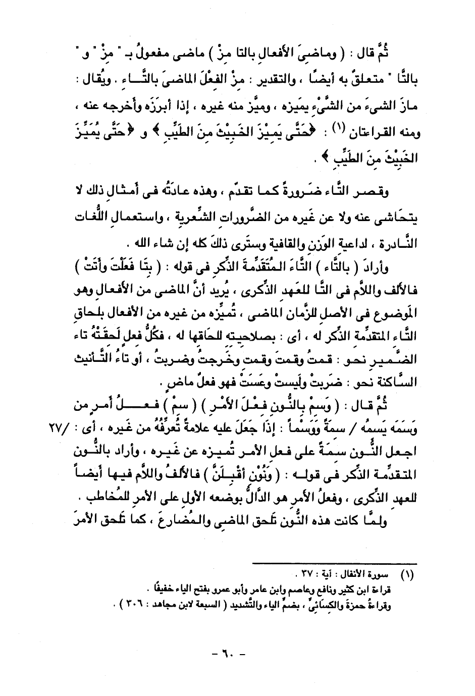 ثم قال: (وماضي الأفعال بالتا مز) ماضي مفعول بـ "مز" و "بالتا" متعلق به أيضا، والتقدير: مز الفعل الماضي بالتاء. ويقال: مازَ الشيء من الشيء يميزه، وميز منه غيره، إذا أبرزه وأخرجه عنه، ومنه القراءتان: ((حَتَّى يَمِيزَ الخَبِيثَ من الطَيِّبِ)) و ((حَتَّي يُمَيِّزَ الخَبِيثَ من الطَيِّبَ)).