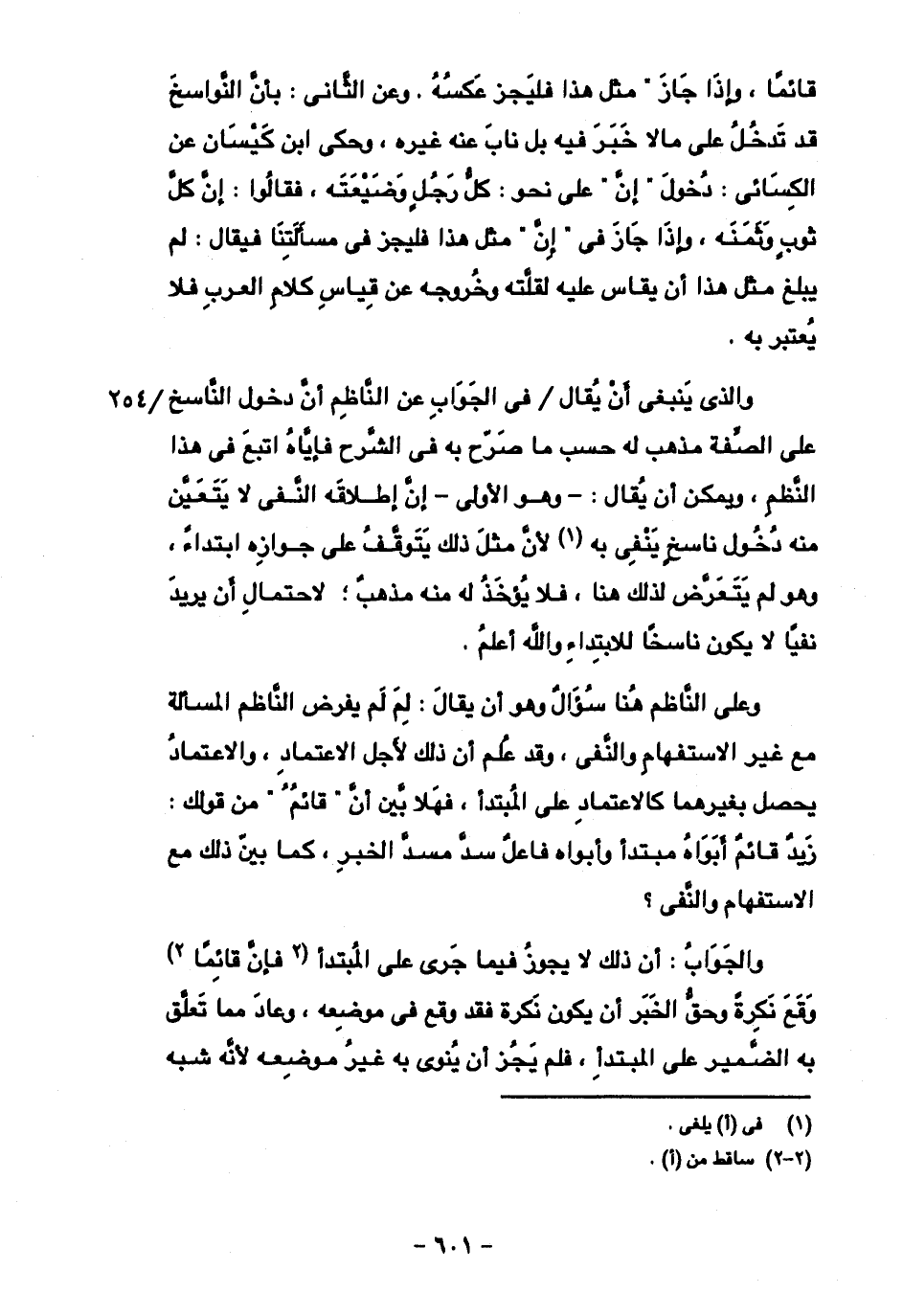 والذي ينبغي أن يقال/ في الجواب عن الناظن أن دخول الناسخ على الصفة مذهب له حسب ما صرح به في الشرح فإياه اتبع في هذا النظم، ويمكن أن يقال: - وهو الأولى- إن إطلاقه النفي لا يتعين منه دخول ناسخ ينفي به لأن مثل ذلك يتوقف على جوازه ابتداء، وهو لم يتعرض لذلك هنا، فلا يؤخذ له منه مذهب؛ لاحتمال أن يريد نفيا لا يكون ناسخا للابتداء والله أعلم.
