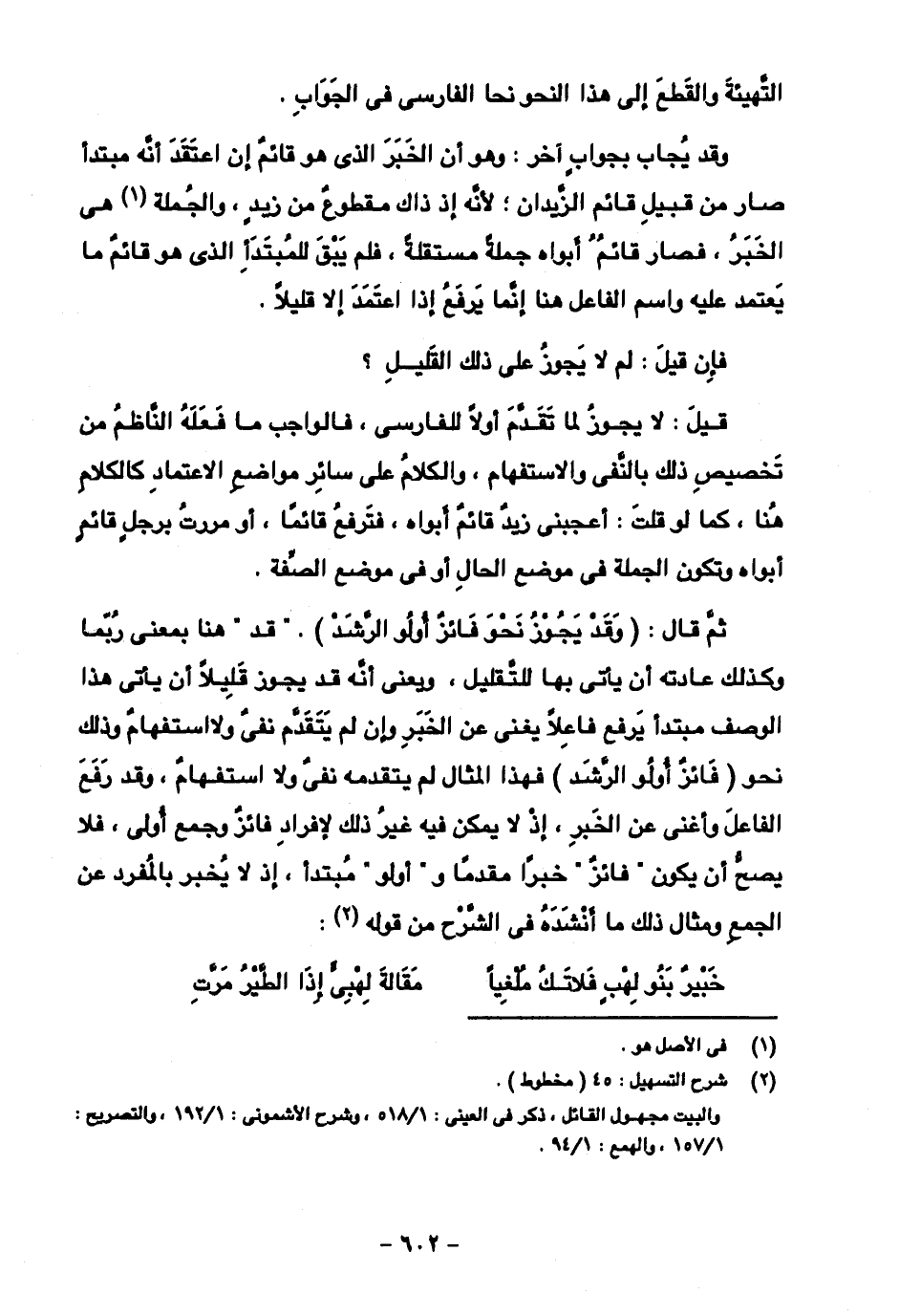 ثم قال: (وقد يجوز نحو فائز أولو الرشد). "قد" هنا بمعنى ربما وكذلك عادته أن يأتي بها للتقليل، ويعني أنه قد يجوز قليلا أن يأتي هذا الوصف مبتدأ يرفع فاعلا يغني عن الخبر وإن لم يتقدم نفي ولا استفهام وذلك نحو (فائز أولو الرشد) فهذا المثال لم يتقدمه نفي ولا استفهام، وقد رفع الفاعل وأغنى عن الخبر، إذ لا يمكن فيه غير ذلك لإفراد فائز وجمع أولى، فلا يصح أن يكون "فائز" خبرا مقدما و "أولو" مبتدأ، إذ لا يخبر بالمفرد عن الجمع ومثال ذلك ما أنشده في الشرح من قوله:
