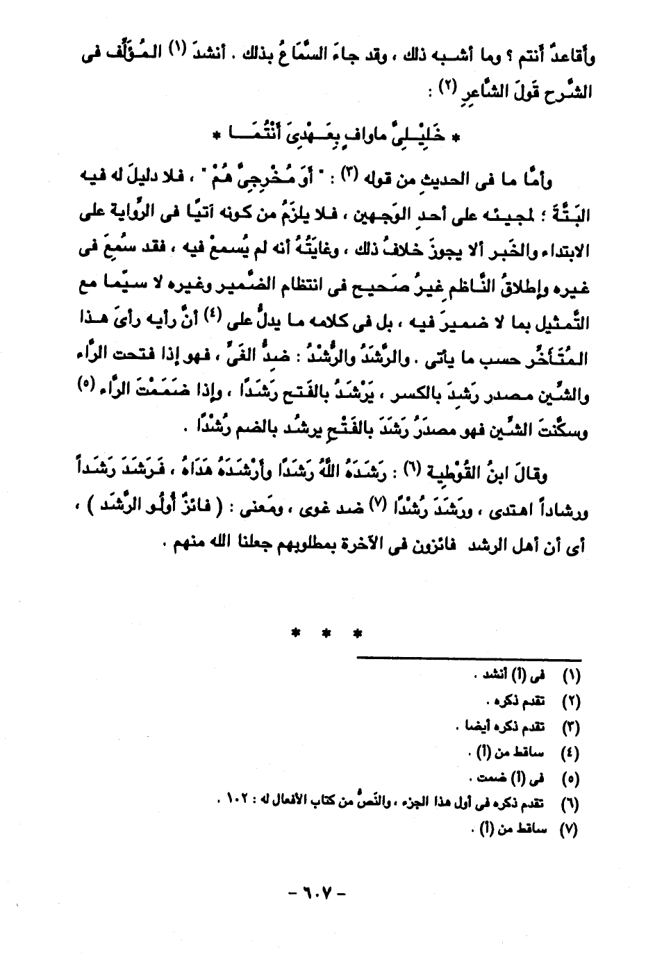 وأما ما في الحديث من قوله: "أو مخرجي هم"، فلا دليل له فيه البتة؛ لمجيئه على أحد الوجهين، فلا يلزم من كونه آتيا في الرواية على الابتداء والخبر ألا يجوز خلاف ذلك، وغايته أنه لم يسمع فيه، فقد سمع في غيره وإطلاق الناظم غير صحيح في انتظام الضمير وغيره لاسيما مع التمثيل بما لا ضمير فيه، بل في كلامه ما يدل على أن رأيه رأى هذا المتأخر حسب ما يأتي. والرشد والرشد: ضد الغي، فهو إذا فتحت الراء والشين مصدر رشد بالكسر، يرشد بالفتح رشدا، وإذا ضممت الراء وسكنت الشين فهو مصدر رشد بالفتح يرشد بالضم رشدا.