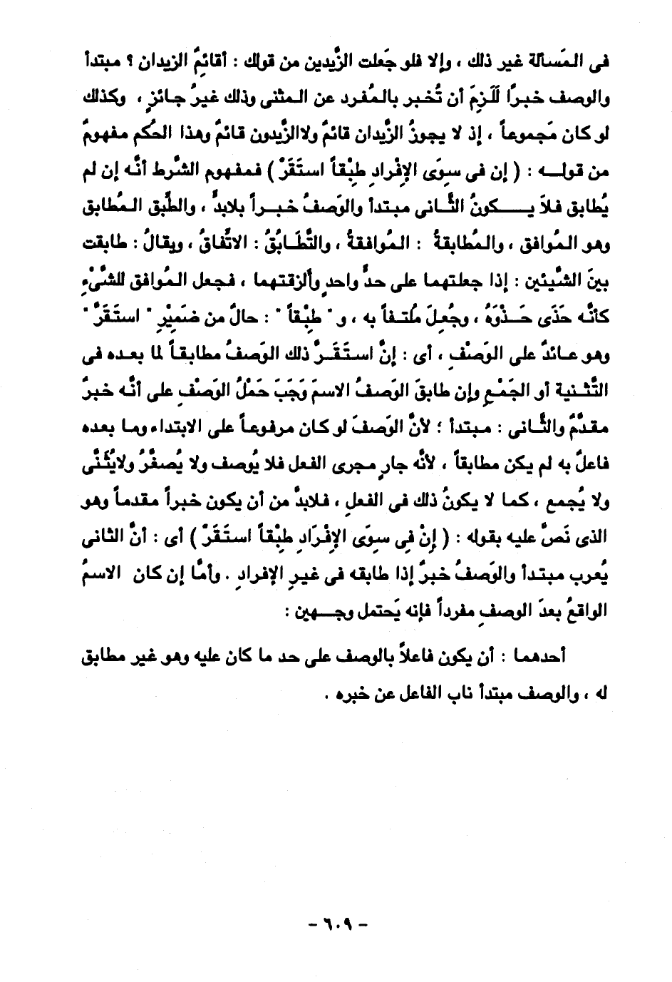في المسألة غير ذلك، وإلا فلو جعلت الزيدين من قولك: أقائم الزيدان؟ مبتدأ والوصف خبرا للزم أن تخبر بالمفرد عن المثنى وذلك غير جائز، وكذلك لو كان مجموعا، إذ لا يجوز الزيدان قائم ولا الزيدون قائم وهذا الحكم مفهوم من قوله: (إن في سوى الإفراد طبقا استقر) فمفهوم الشرط أنه إن لم يطابق فلا يكون الثاني مبتدأ والوصف خبرا بلابد، والطبق المطابق وهو الموافق، والمطابقة: الموافقة، والتطابق: الاتفاق، ويقال: طابقت بين الشيئين: إذا جعلتهما على حد واحد وألزقتهما، فجعل الموافق للشيء كأنه حذى حذوه، وجعل ملتفا به، و"طبقا": حال من ضمير "استقر" وهو عائد على الوصف، أي: إن استقر ذلك الوصف مطابقا لما بعده في التثنية أو الجمع وإن طابق الوصف الاسم وجب حمل الوصف على أنه خبر مقدم والثاني: مبتدأ؛ لأن الوصف لو كان مرفوعا على الابتداء وما بعده فاعل به لم يكن مطابقا، لأنه جار مجرى الفعل فلا يوصف ولا يصغر ولا يثنى ولا يجمع، كما لا يكون ذلك في الفعل، فلابد من أن يكون خبرا مقدما وهو الذي نص عليه بقوله: (إن في سوى الإفراد طبقا استقر) أي: أن الثاني يعرب مبتدأ والوصف خبر إذا طابقه في غير الإفراد. وأما إن كان الاسم الواقع بعد الوصف مفردا فإنه يحتمل وجهين: