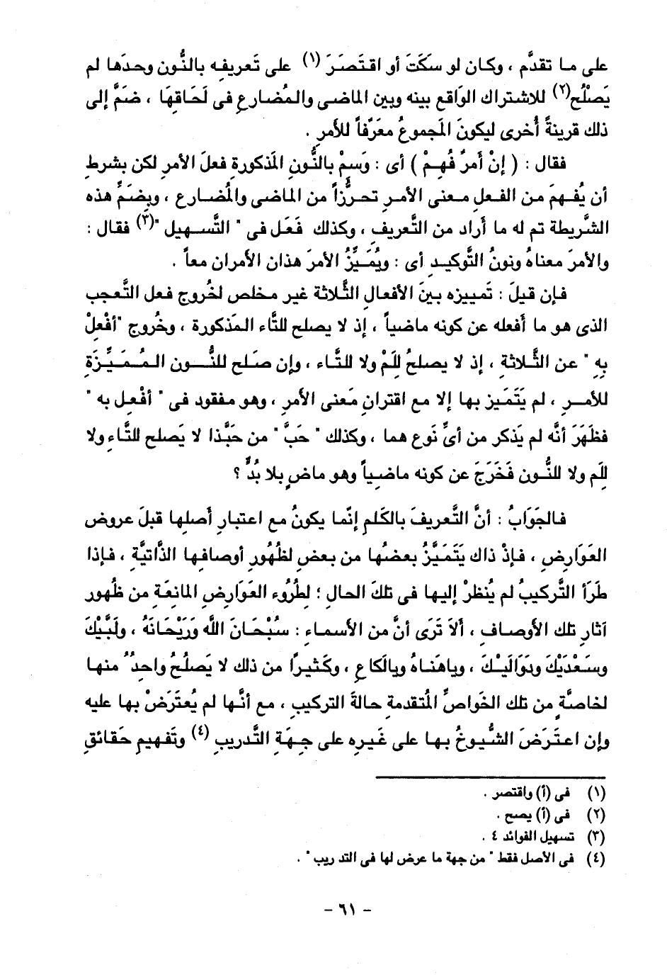 على ما تقدم، وكان لو سكت أو اقتصر على تعريفه بالنون وحدها لم يصلح للاشتراك الواقع بينه وبين الماضي والمضارع في لحاقها، ضم غلى ذلك قرينة أخرى ليكون المجموع معرفا للأمر.